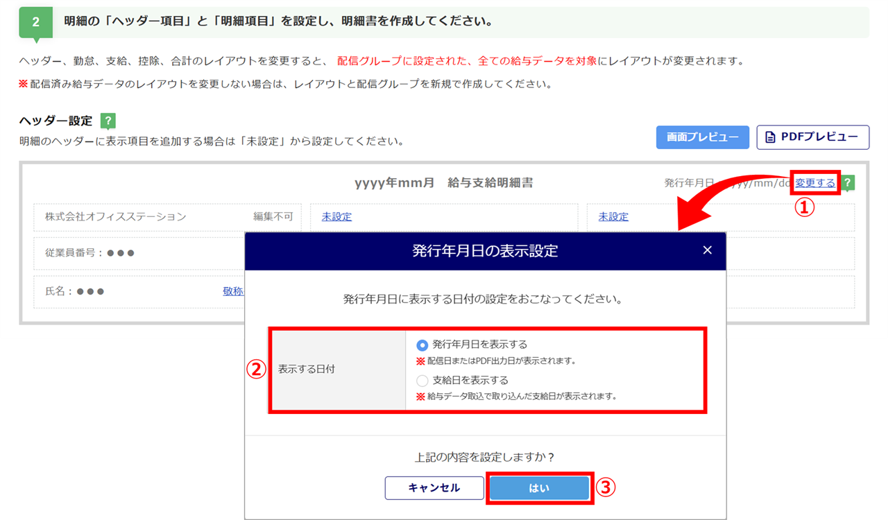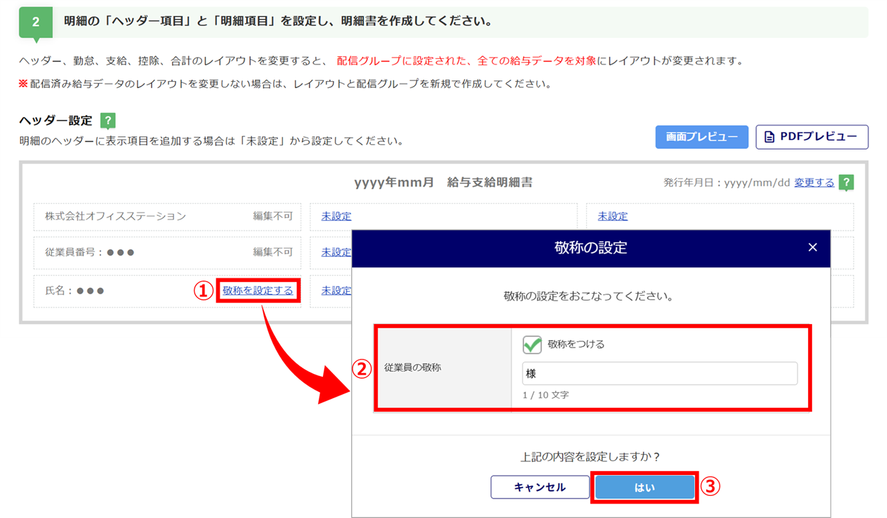 明細に表示される従業員氏名に敬称をつける場合は、[敬称を設定する](①)をクリックし、「従業員の敬称」(②)の「敬称をつける」にチェック、「敬称」を入力後、[はい](③)をクリックします。