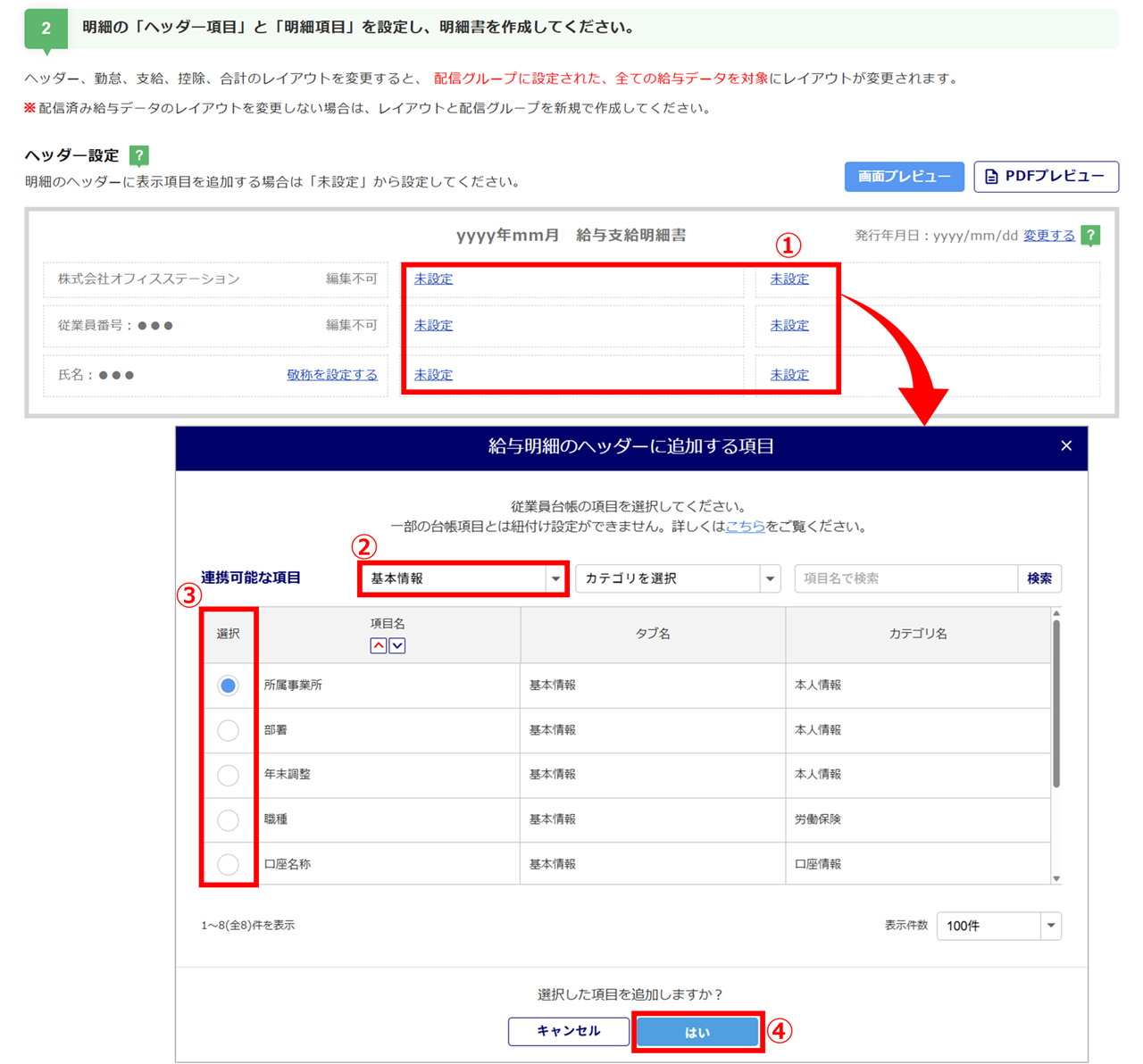 「台帳のタブ名」(②)を選択し、明細のヘッダーに追加する従業員台帳の項目の「選択」列(③)にチェックし、[はい](④)をクリックします。