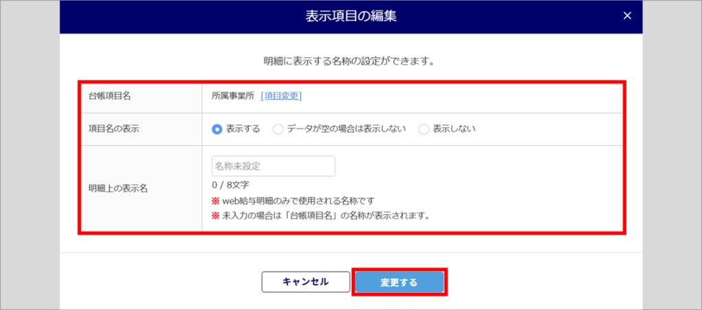 | 明細上の表示名 | 「明細のみで使用される名称を設定できます。※8文字まで 未入力の場合は、「台帳項目名」が表示されます。 |