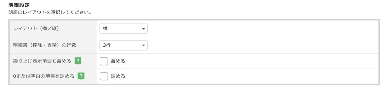 | 明細書(控除・支給)の行数 | 控除・支給に関してのみ、2行~4行まで選択できます。 |