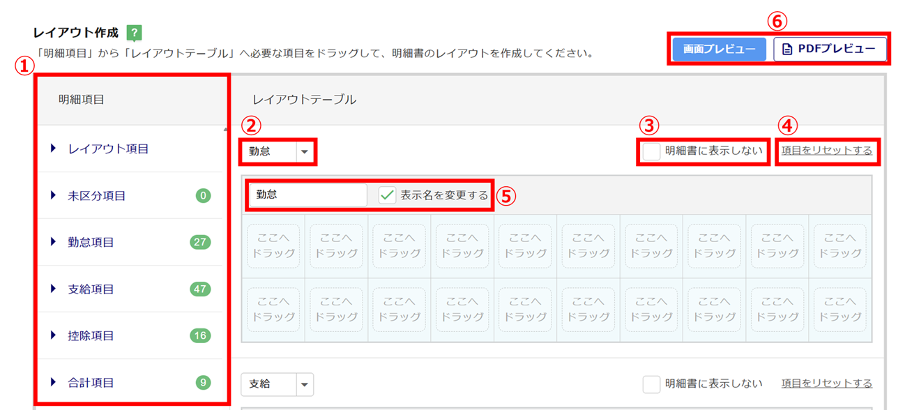 | ⑤ | 表示名を変更する | 「勤怠」「支給」「控除」の見出しの明細表示名を変更する場合は、「表示名を変更する」にチェックし、表示名を編集します。 ※10文字まで |