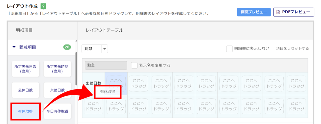 「明細項目」をドラッグ&ドロップで「レイアウトテーブル」に移動します。
