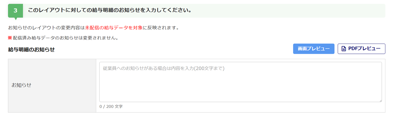 選択しているレイアウトを使用する給与明細に表示するお知らせを設定します。