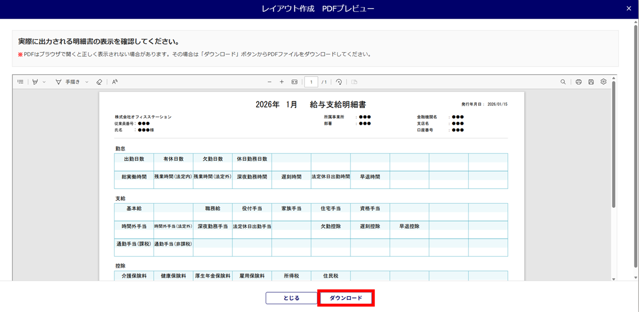 [PDFプレビュー]をクリックすると、「レイアウト作成 PDFプレビュー」画面が開き、設定内容を確認できます。