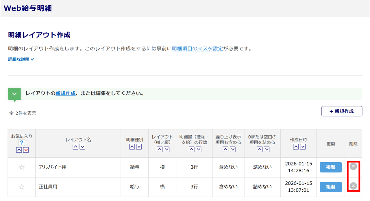 明細レイアウトの一覧に、作成したレイアウトが表示されます。
