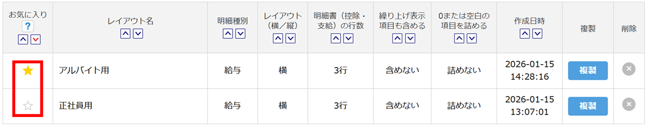 「お気に入り」列の「☆」にチェックを入れると、レイアウト選択時にリストの上位に表示されます。