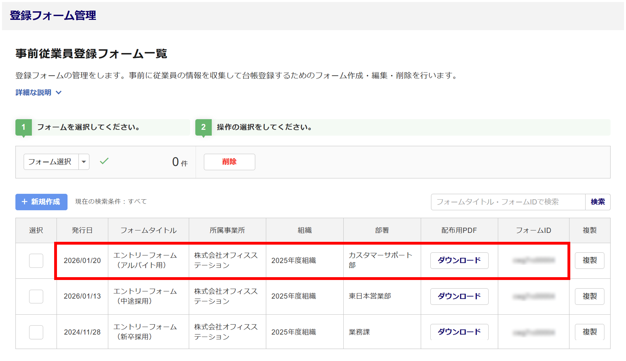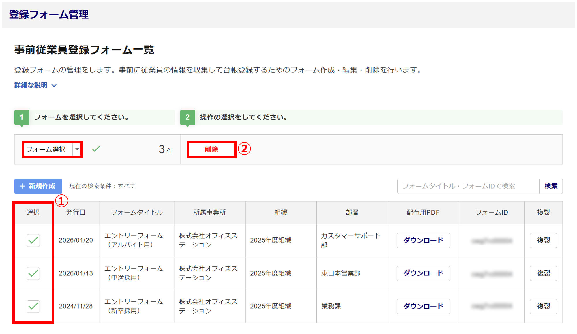 削除するフォームの「選択」列(①)をチェックし、[削除](②)をクリックします。