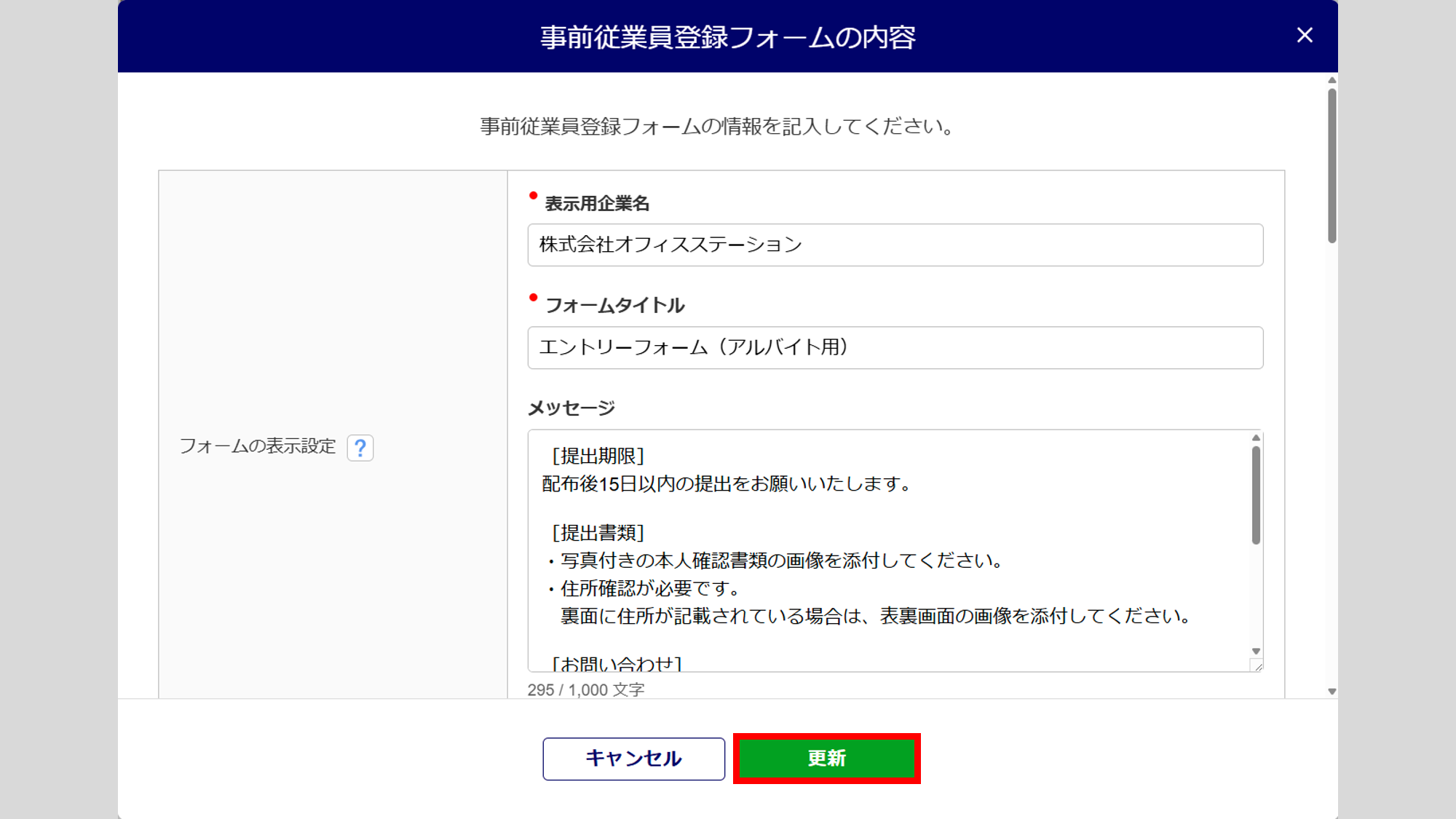 「事前従業員登録フォームの内容」画面にて、登録内容を編集し、[更新]をクリックします。