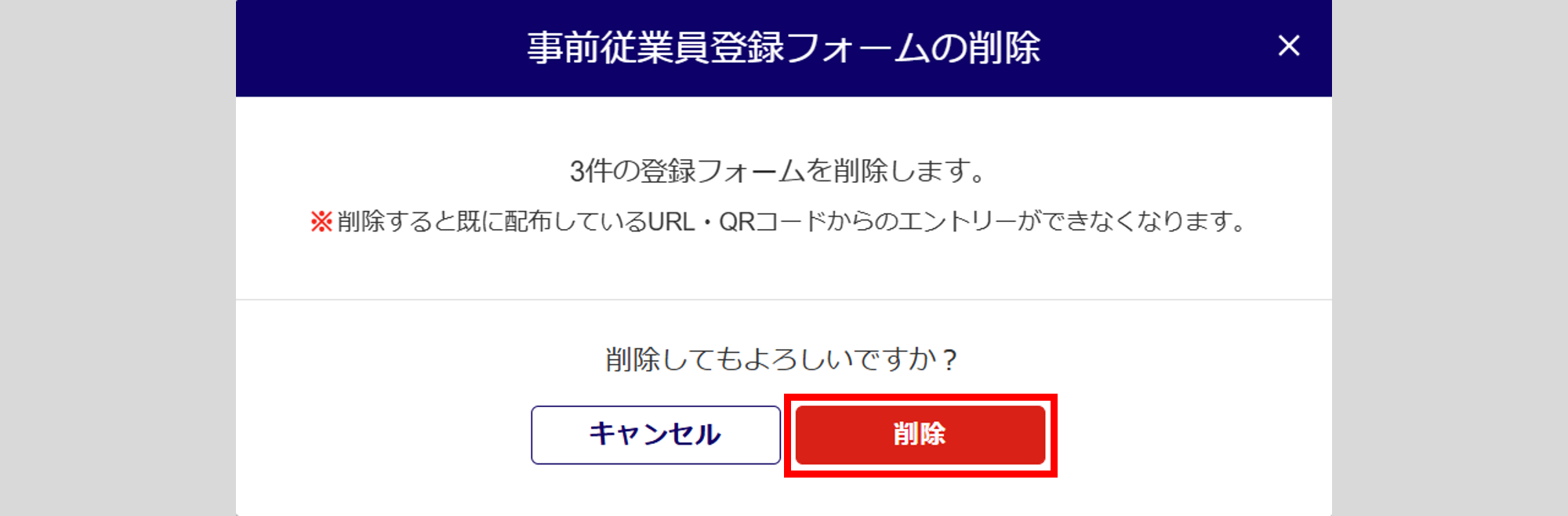 登録フォームを削除した場合、既に配布しているURL・QRコードからのエントリーができなくなります。