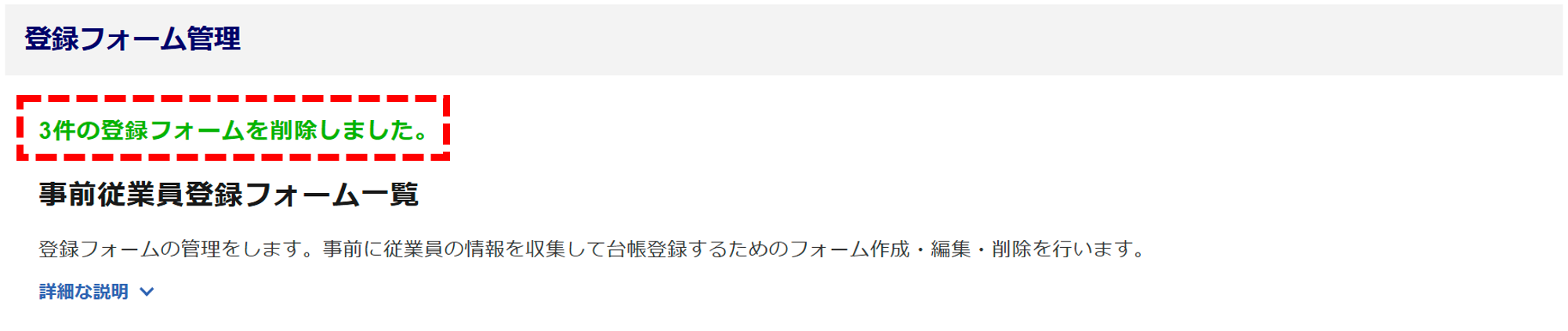 画面左上に「〇件の登録フォームを削除しました。」と表示されたら、登録フォームの削除は完了です。
