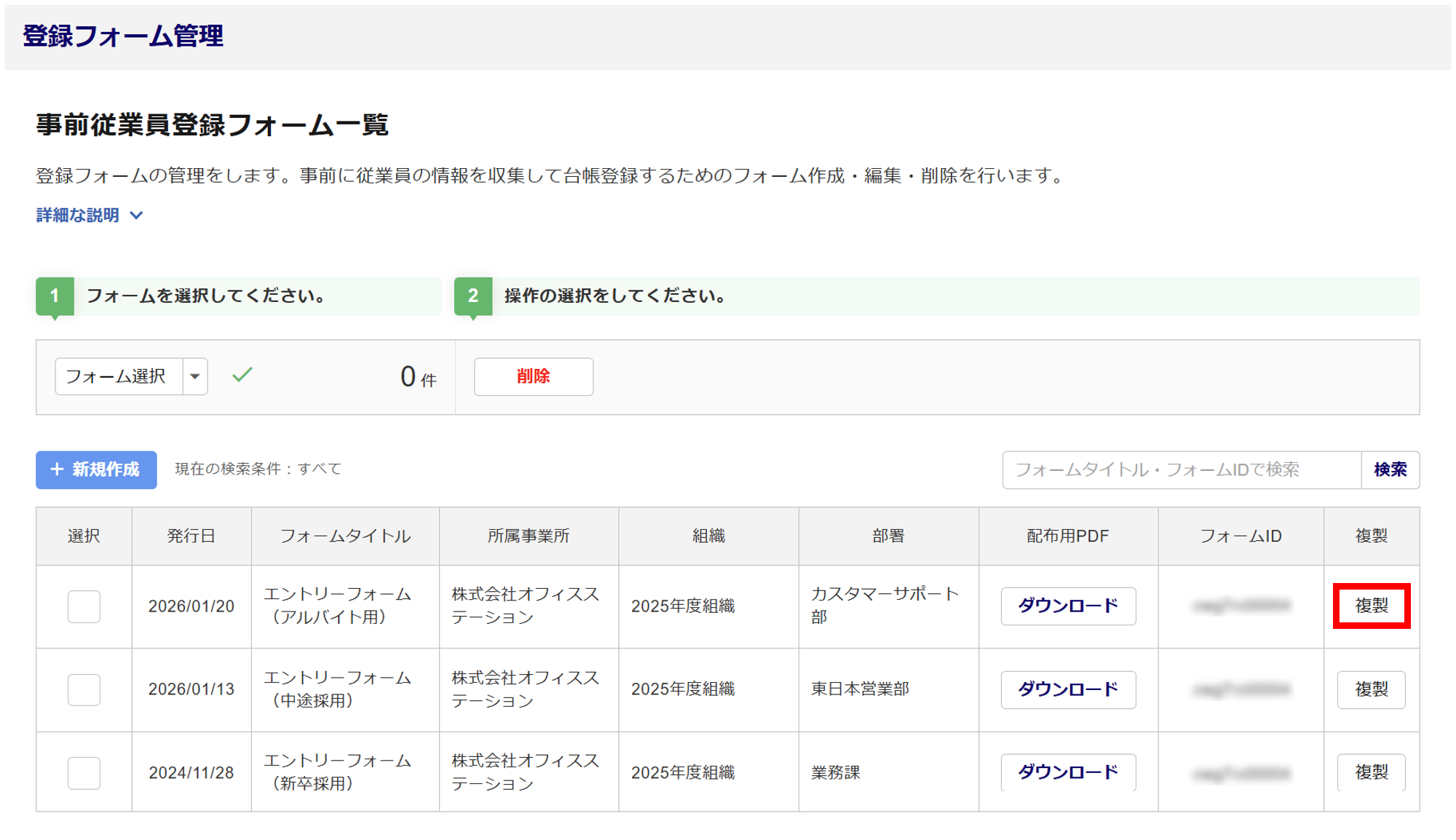 対象フォームの「複製」列の[複製]をクリックします。