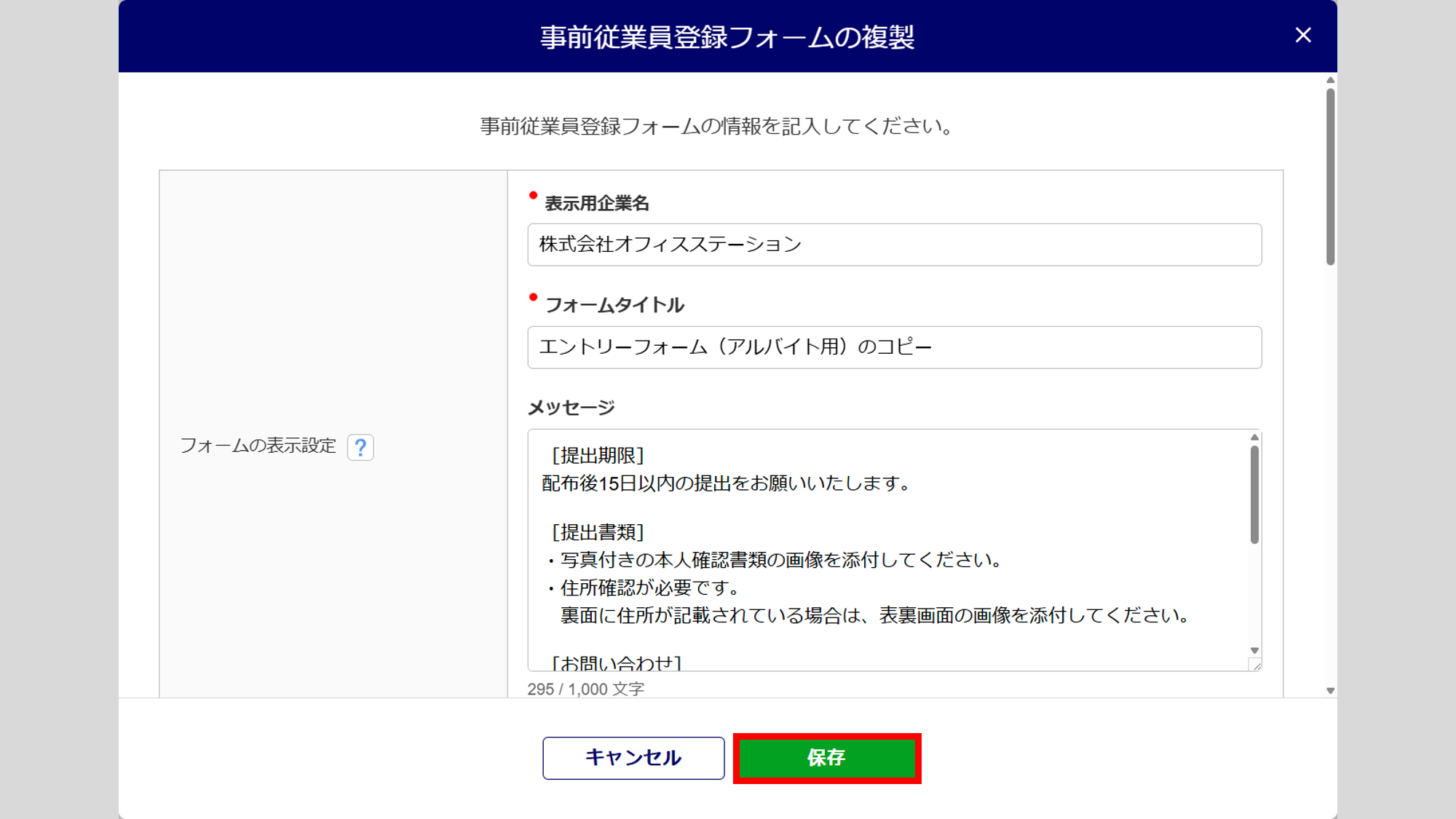 「事前従業員登録フォームの複製」画面にて、各項目を設定し、[保存]をクリックします。