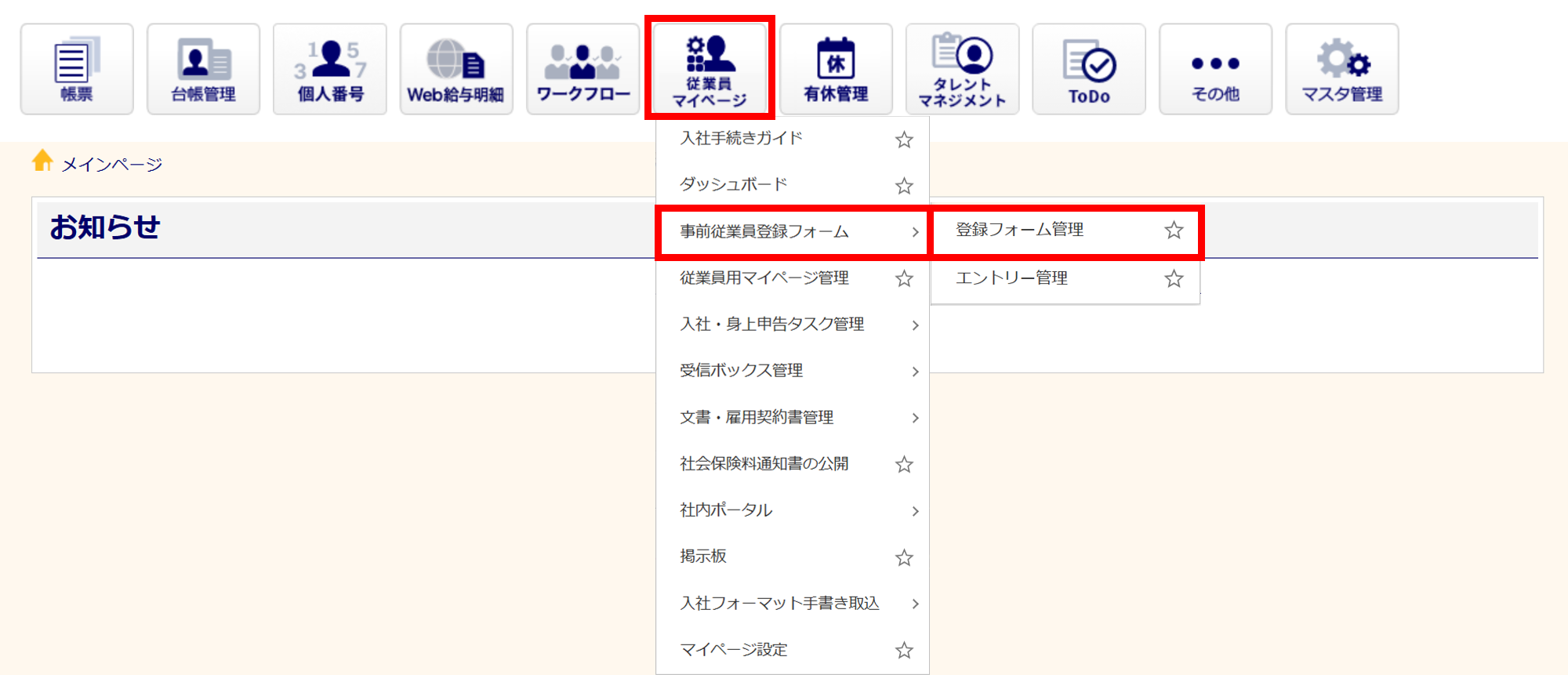 [従業員マイページ]>[事前従業員登録フォーム]>[登録フォーム管理]をクリックします。