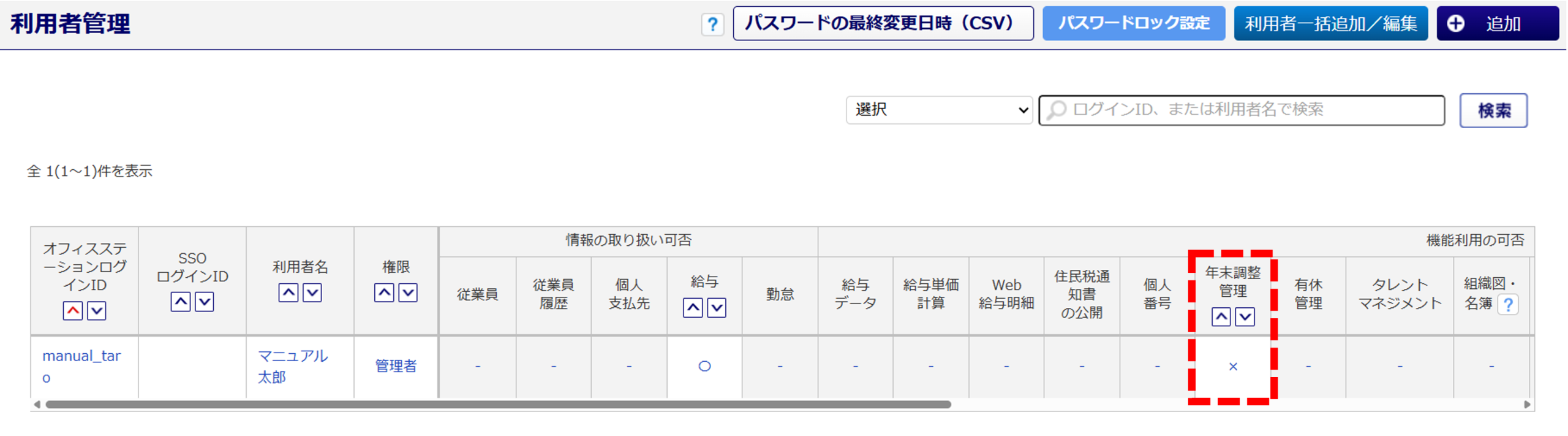 場合、ログインしている利用者の「年末調整管理の利用」が「可」となっていない可能性があります。