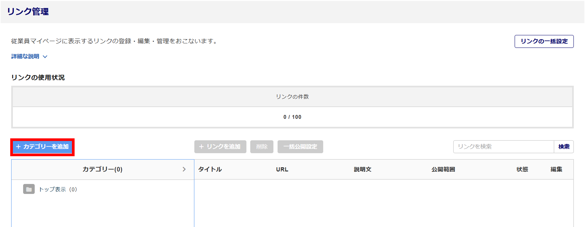 リンクを追加したいカテゴリー()を選択し、[リンクを追加]()をクリックします。