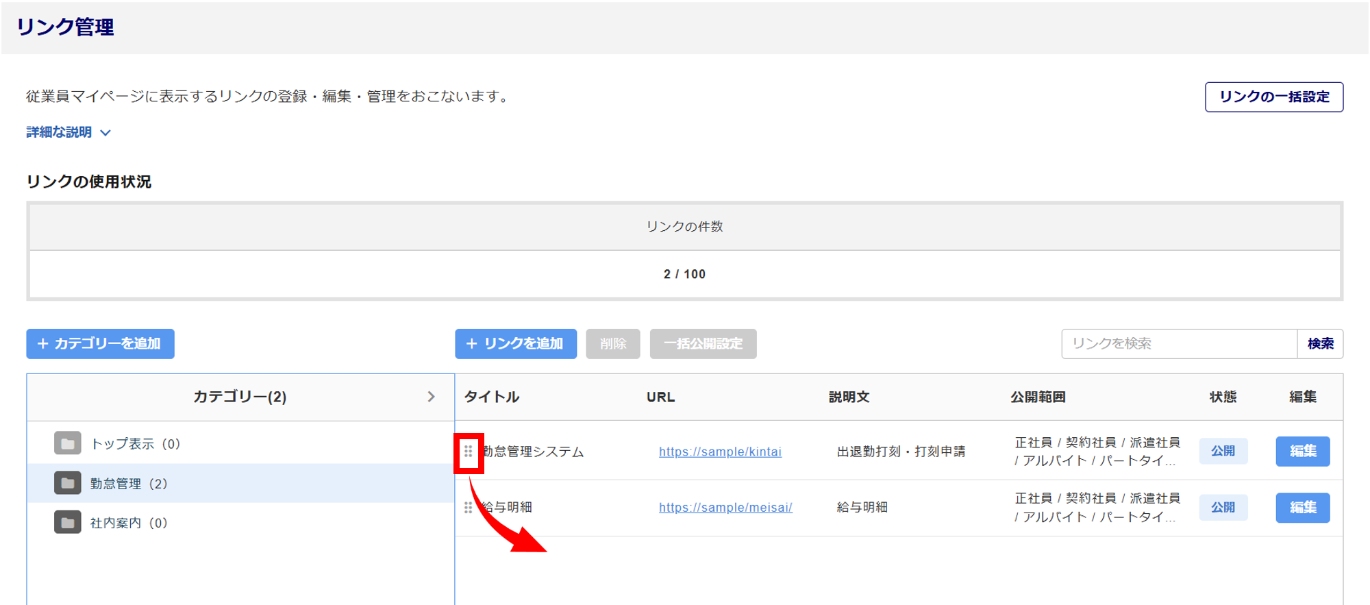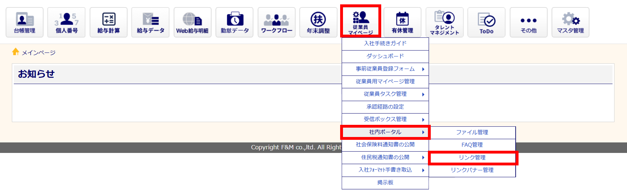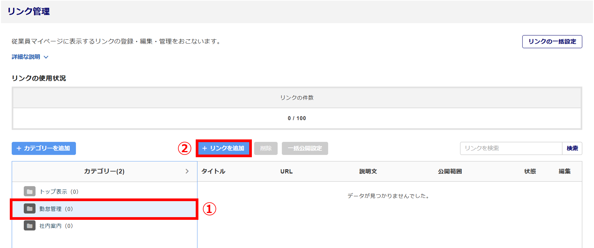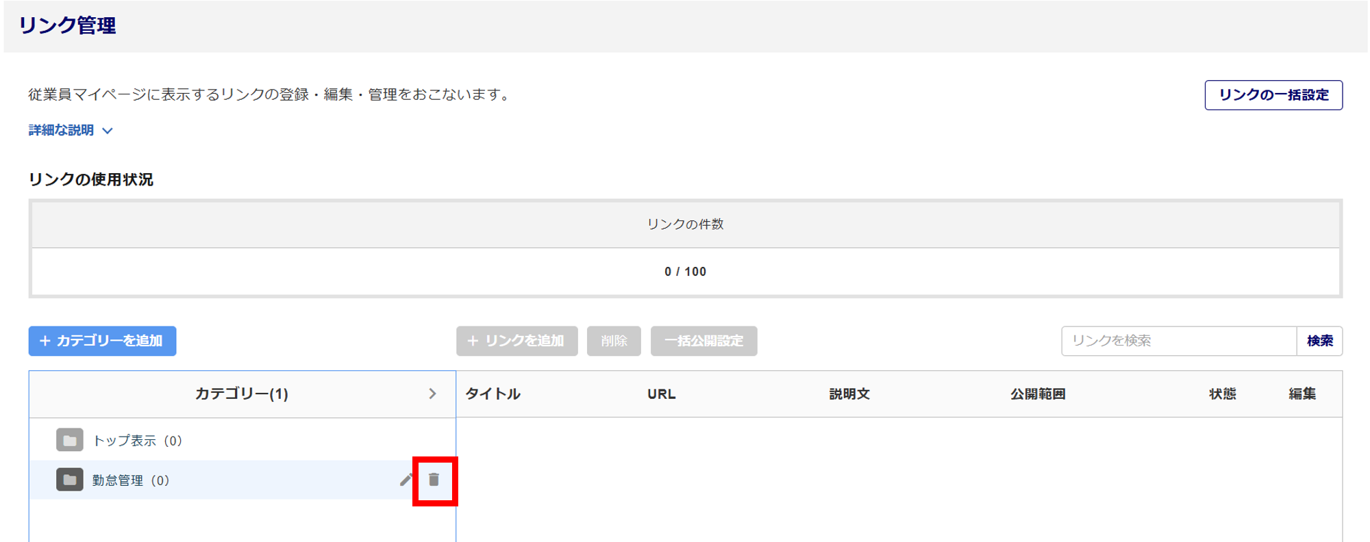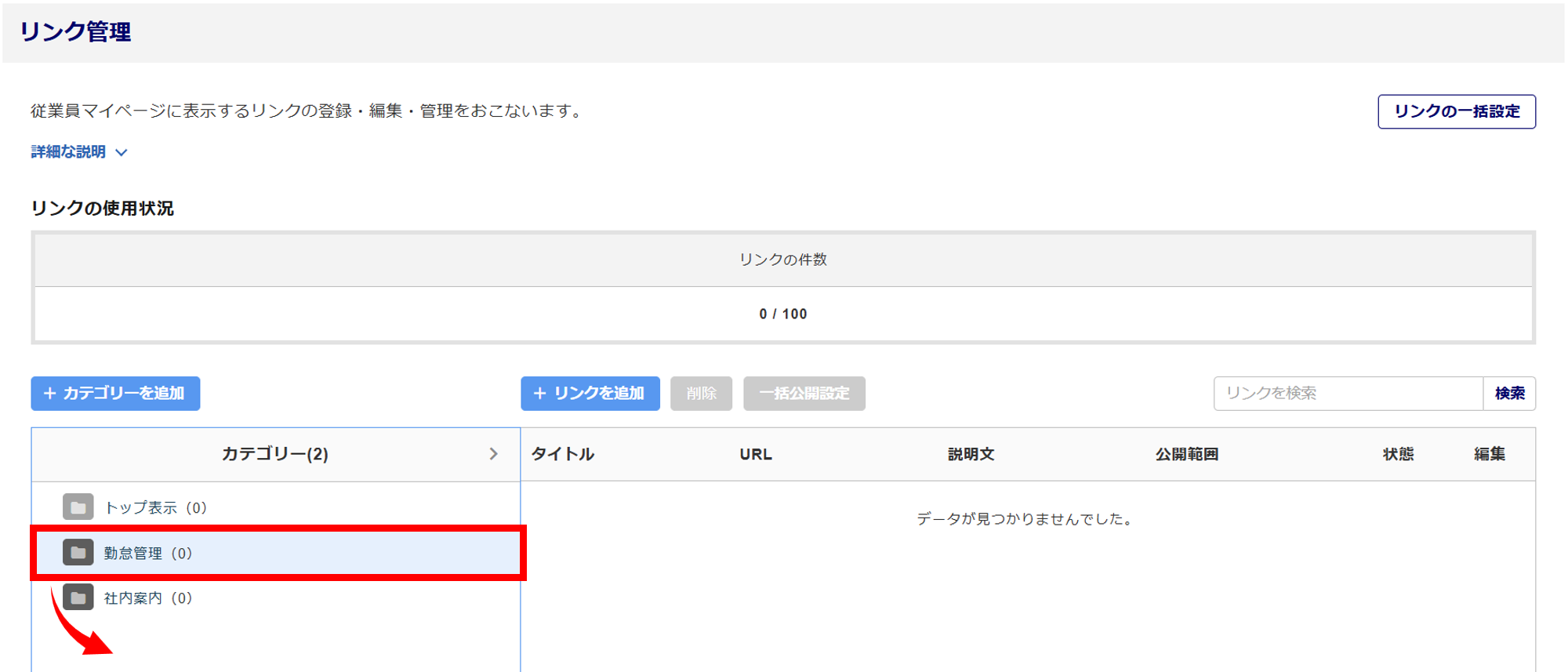 [従業員マイページ]>[社内ポータル]>[リンク管理]をクリックします。