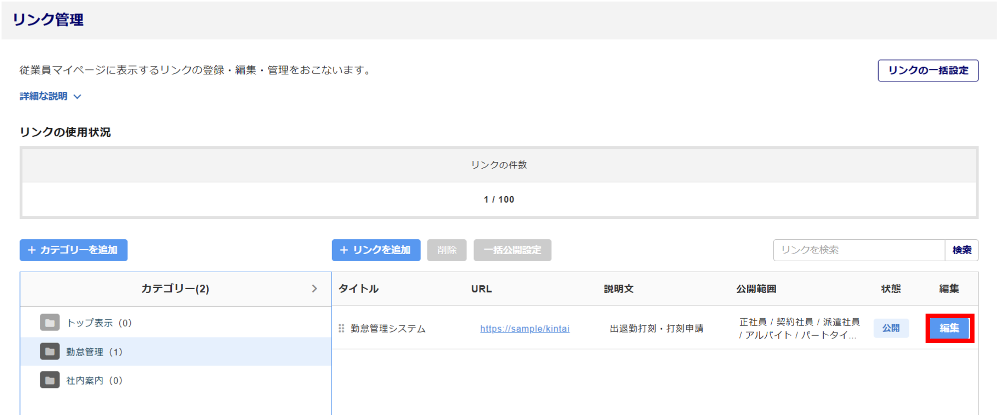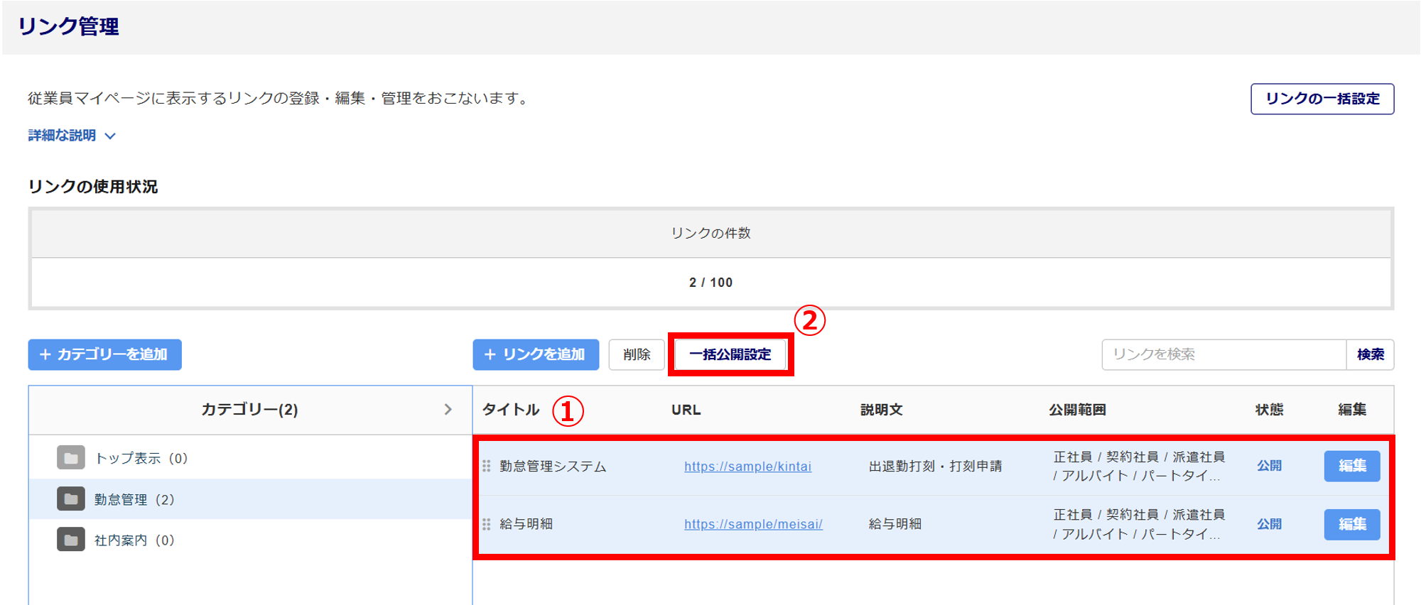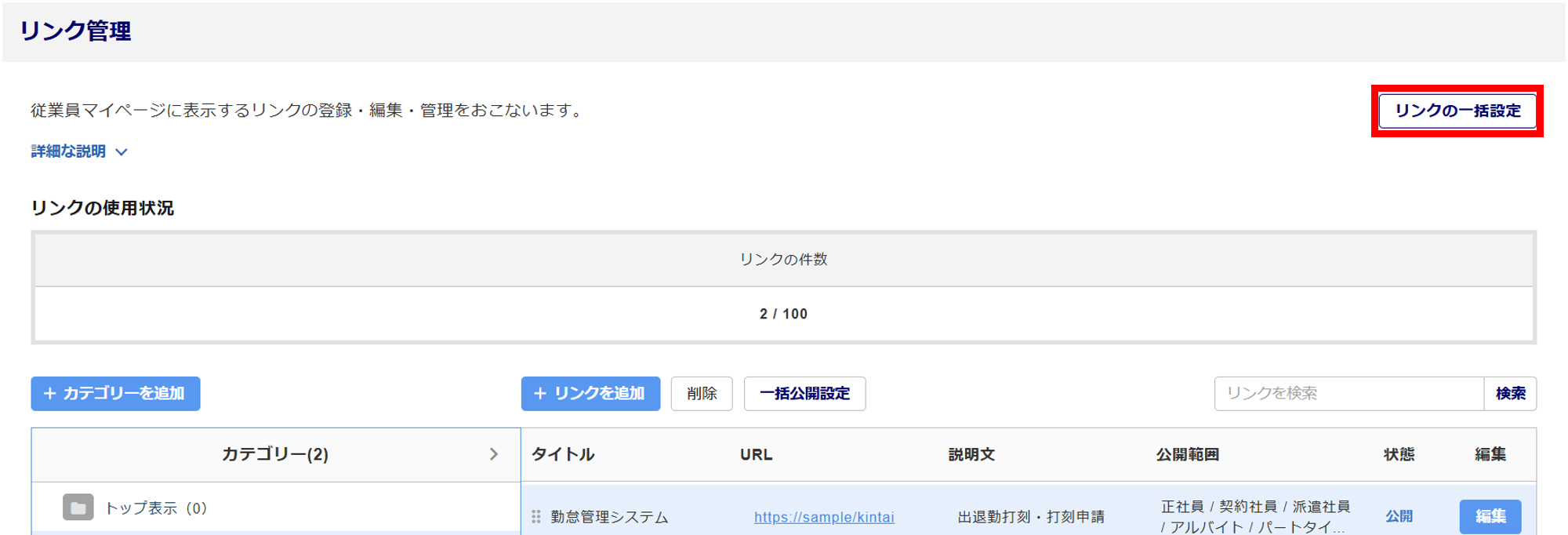 設定を変更したいリンク()を選択し、[一括公開設定]()をクリックします。