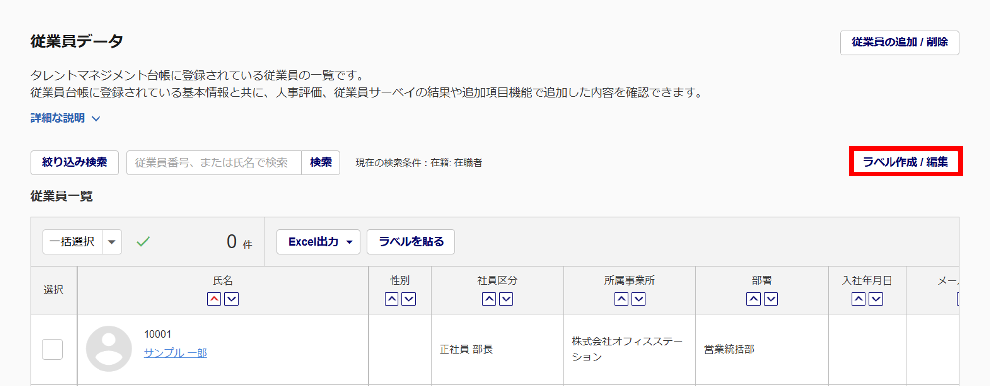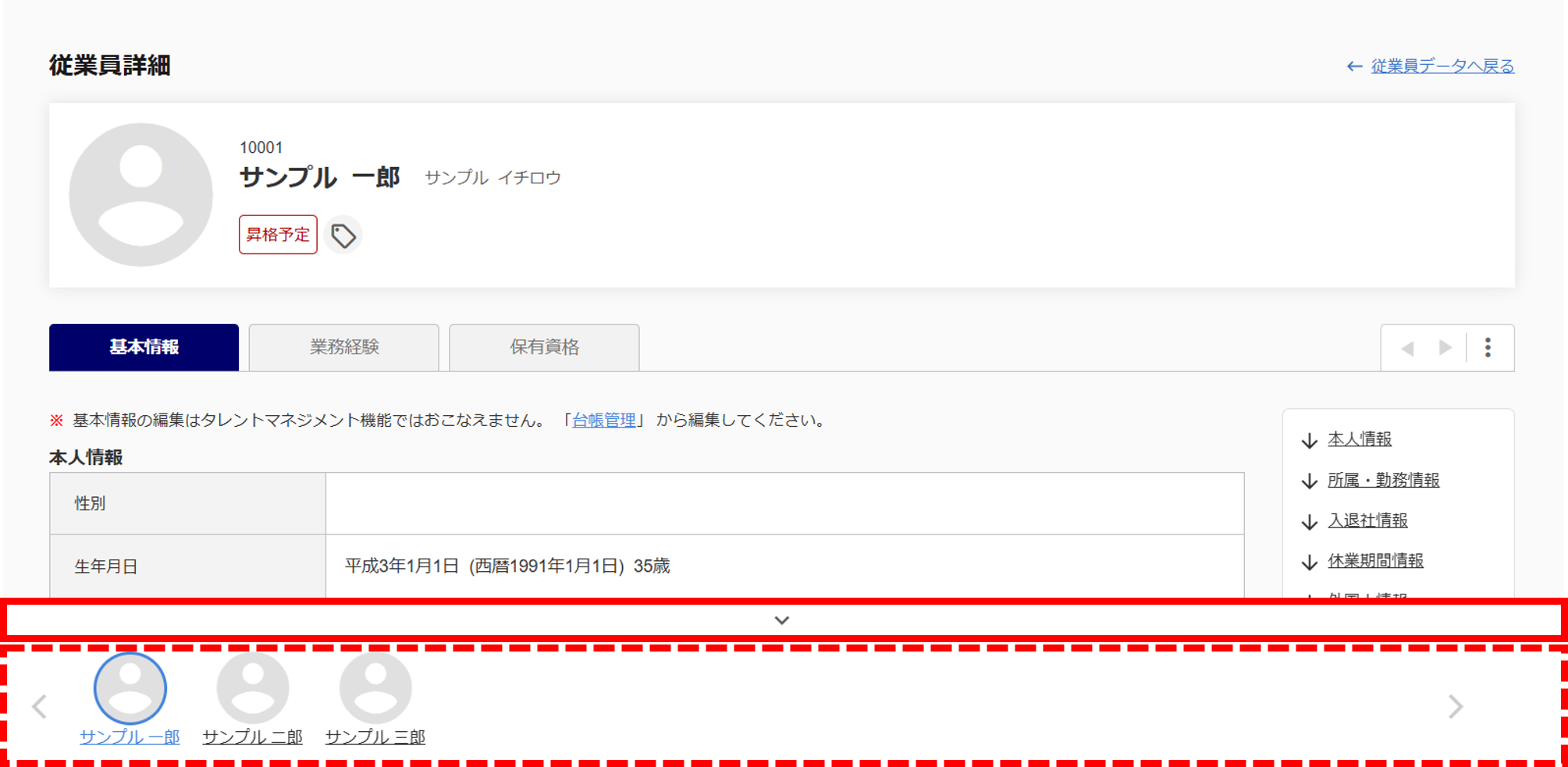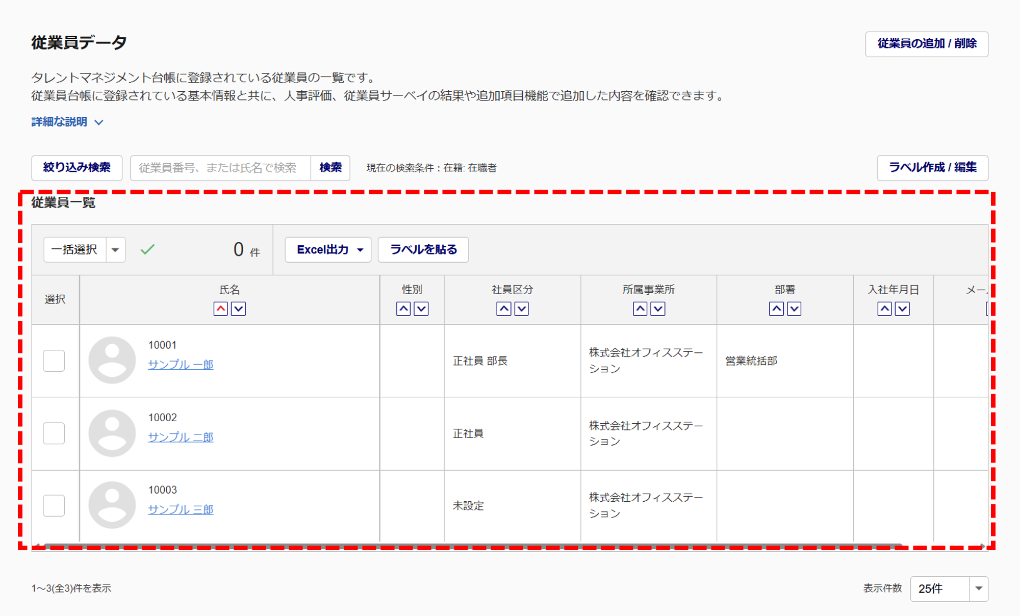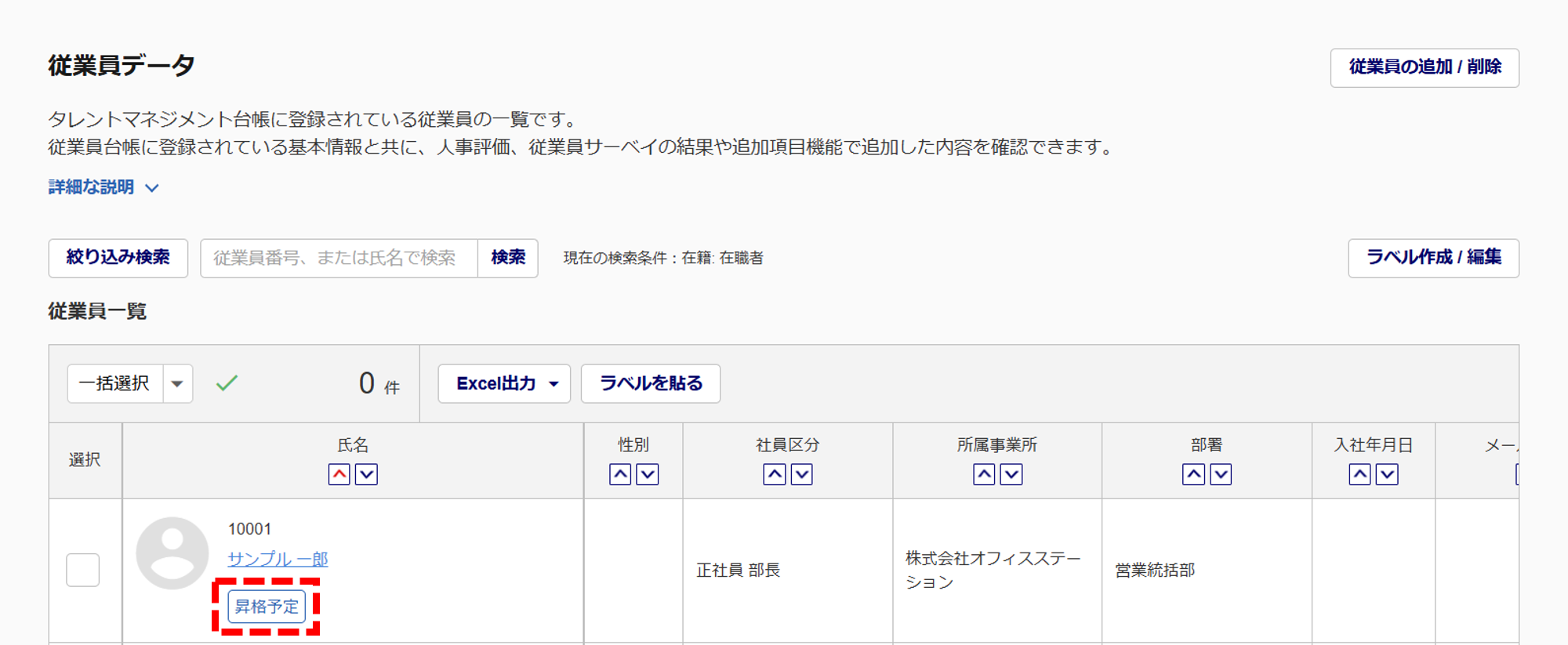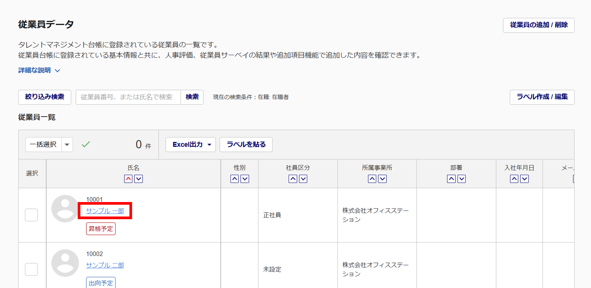 従業員一覧画面には、台帳管理にて「タレントマネジメント用台帳」の登録がある従業員が一覧で表示されます。