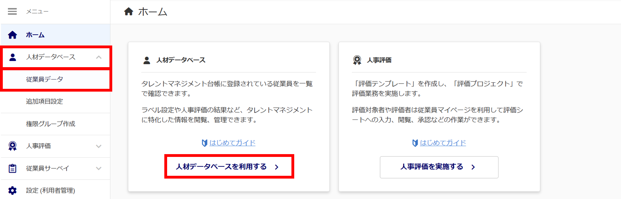 メニュー[人材データベース]>[従業員データ]または、ホーム画面内[人材データベースを利用する]をクリックします。