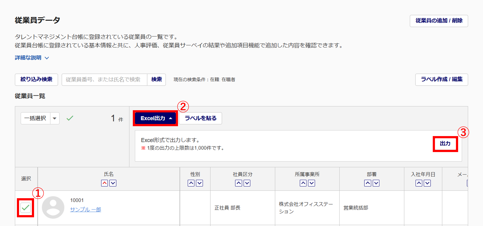 出力したい従業員を選択()>[Excel出力]()>[出力]()をクリックします。