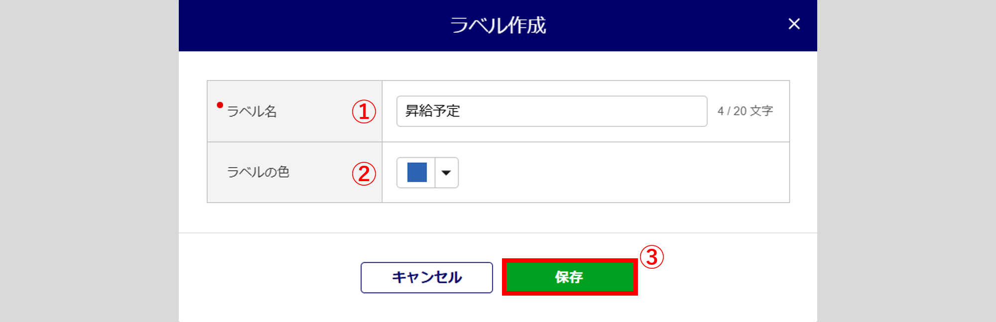 「ラベル名」()を入力>「ラベルの色」()を選択>[保存]()をクリックします。