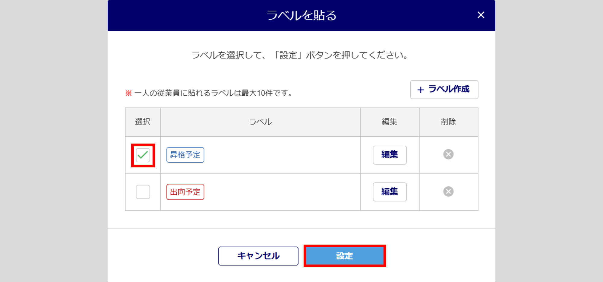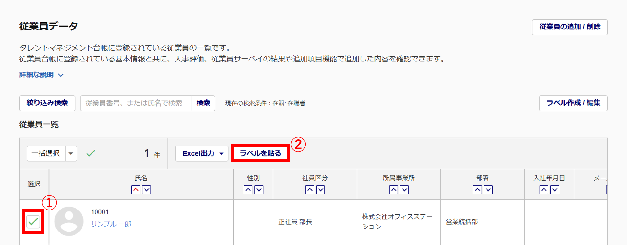 ラベルを従業員へ設定する場合、対象従業員を選択()>[ラベルを貼る]()をクリックします。