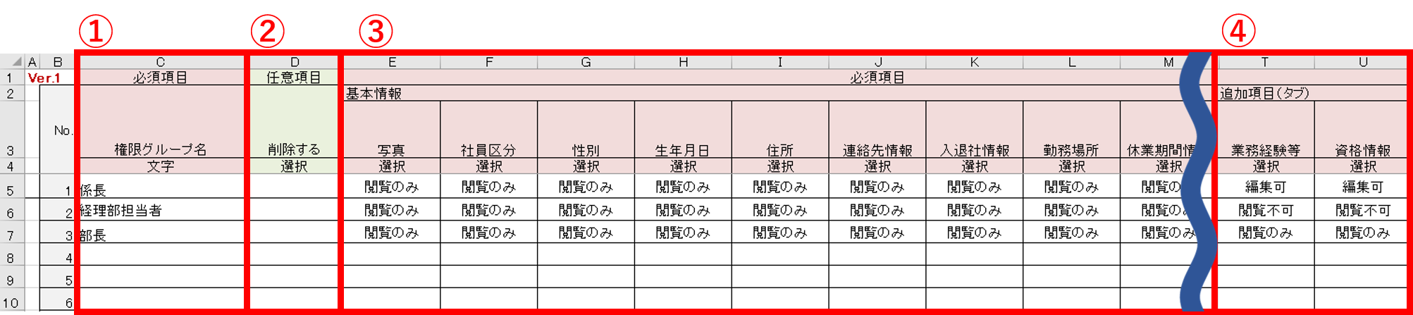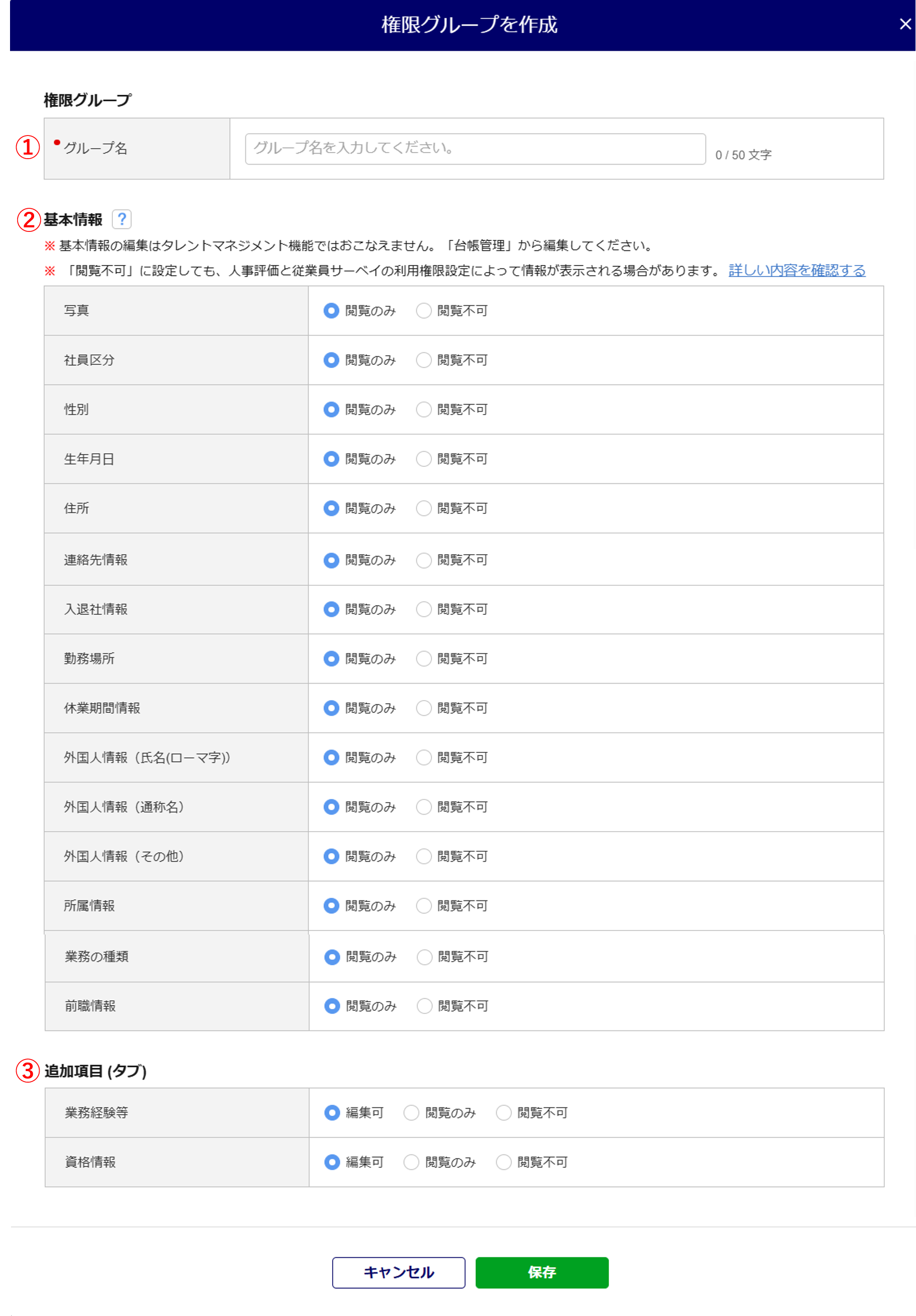 | ④ | 追加項目(タブ) | 人材データベースの「追加項目設定」にて追加した項目のタブ名がすべて表示されます。 編集・閲覧可否をすべてのタブ名の列に設定します。 |