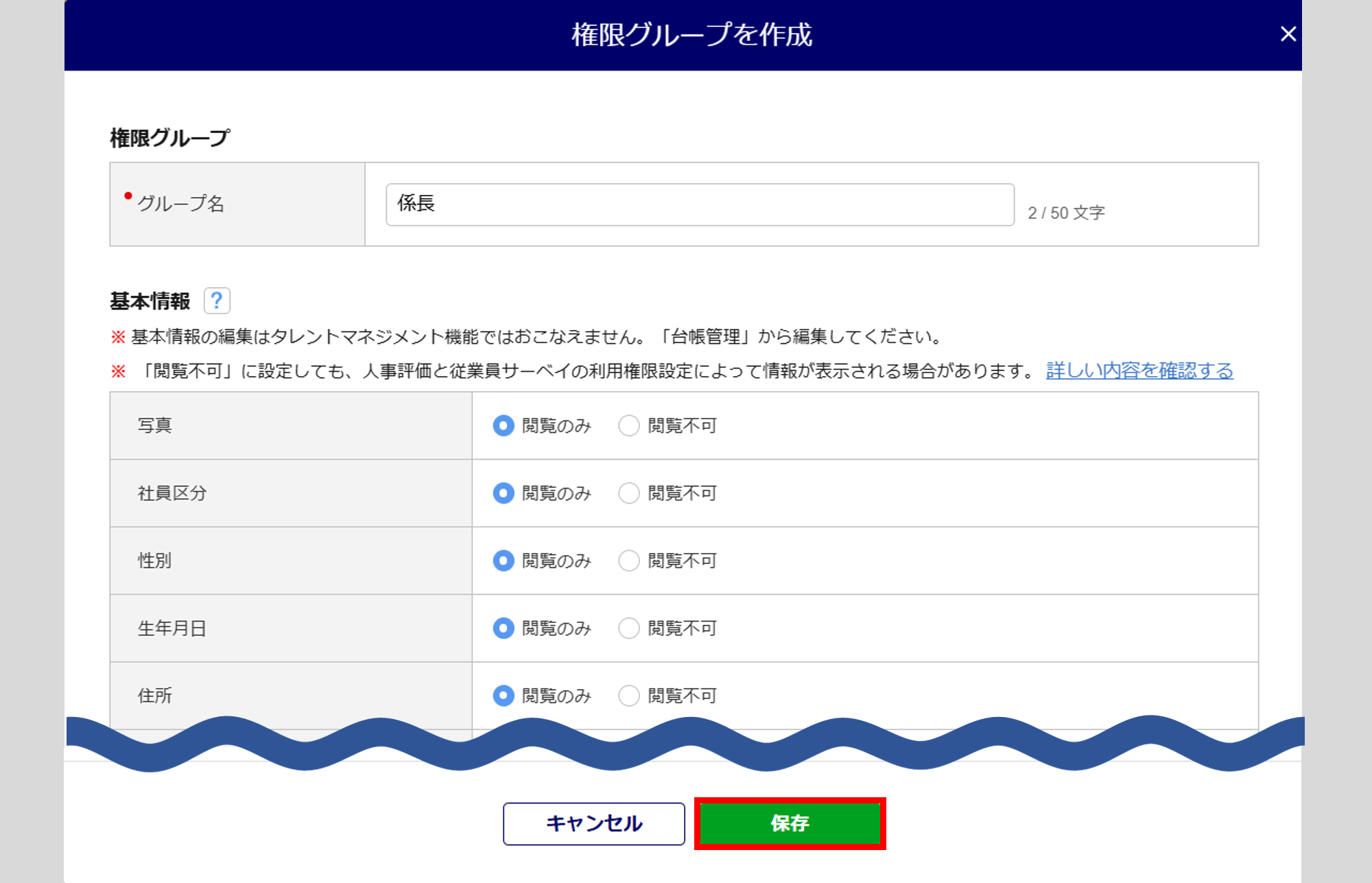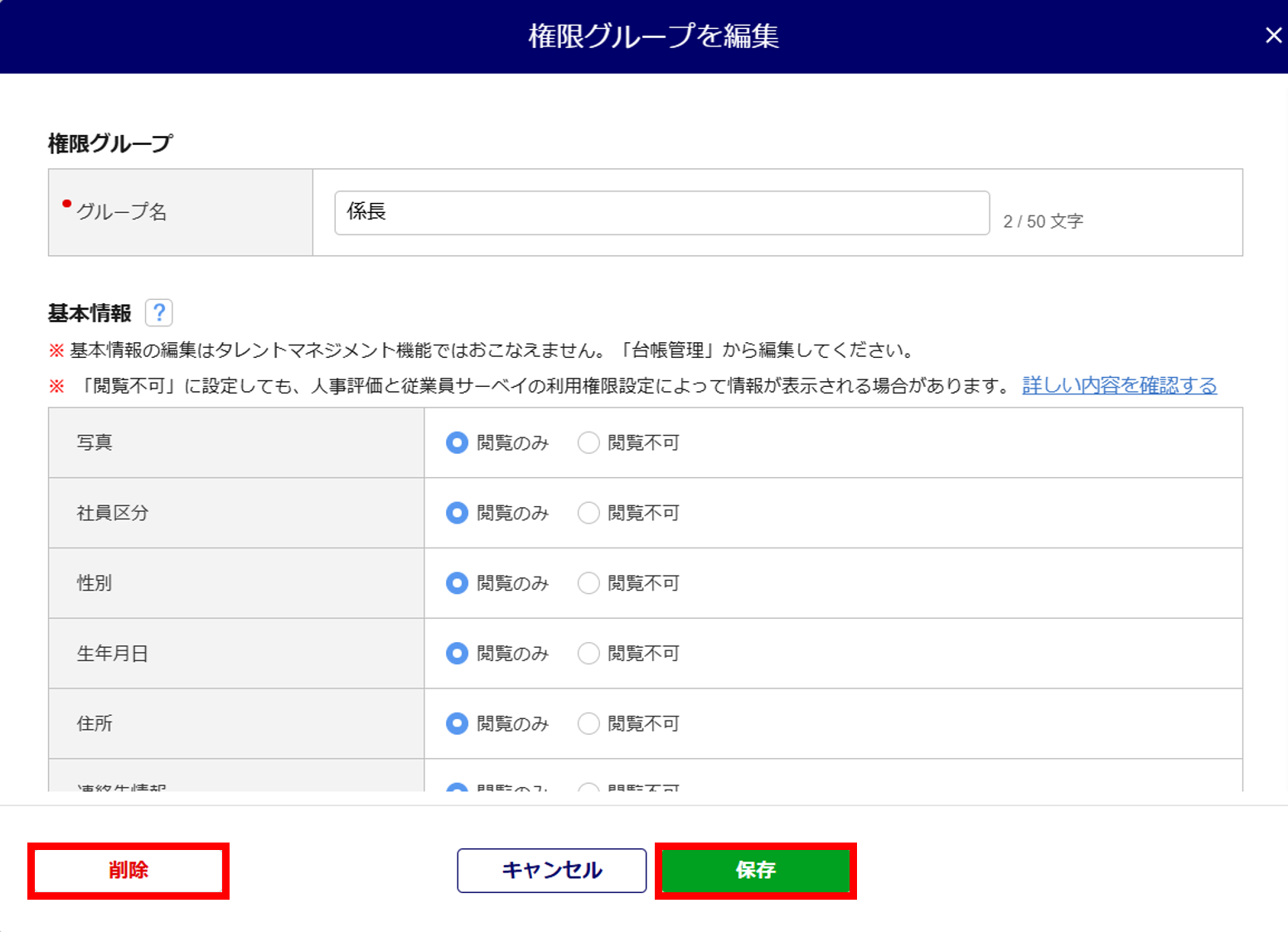 「閲覧のみ」「閲覧不可」のいずれかを設定できます。 初期値では、基本情報すべてが「閲覧のみ」と選択されています。 閲覧不可とするカテゴリは「閲覧不可」に変更します。 |