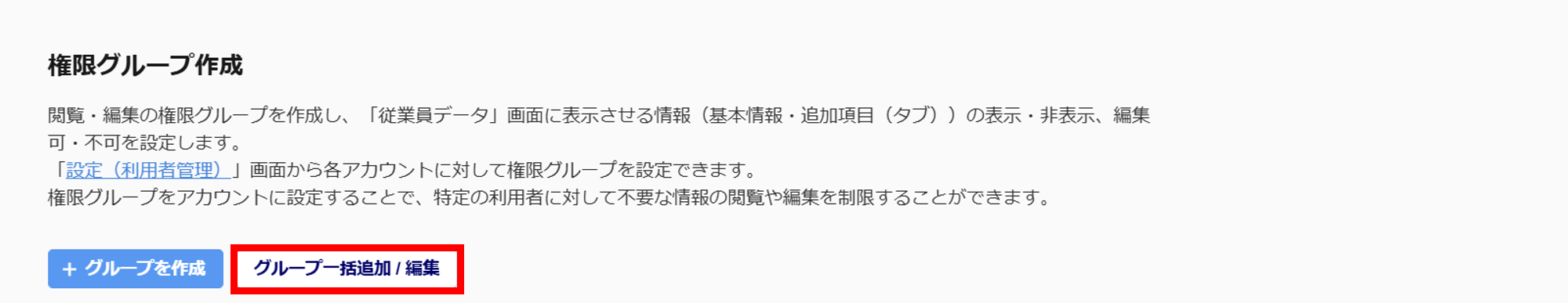 対象の権限グループを「設定(利用者管理)」の「閲覧・編集制限」に設定している場合は、制限が解除されますので、ご留意ください。