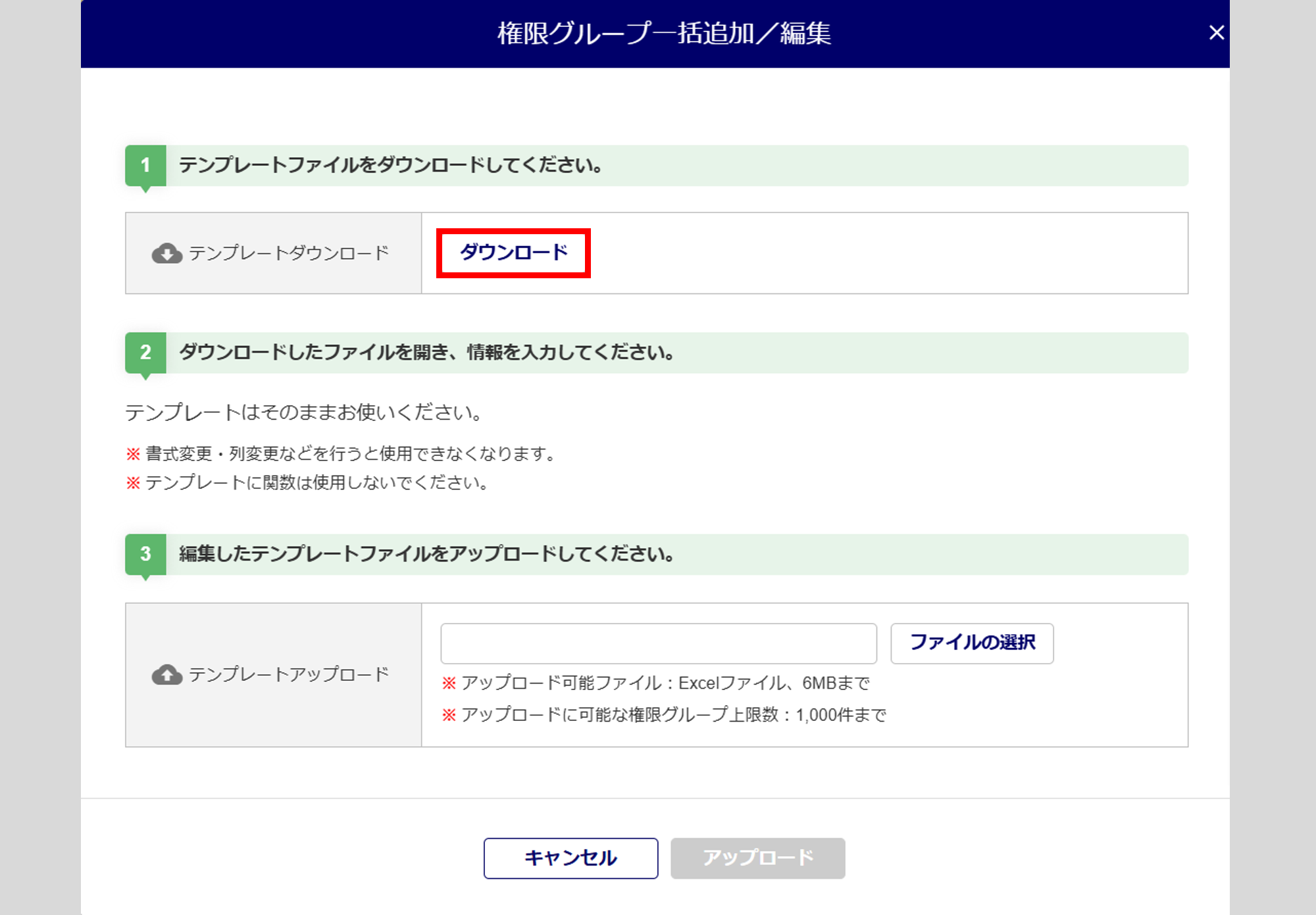 画面左上に「アップロードが完了しました。」と表示されたら権限グループの一括追加・編集は完了です。