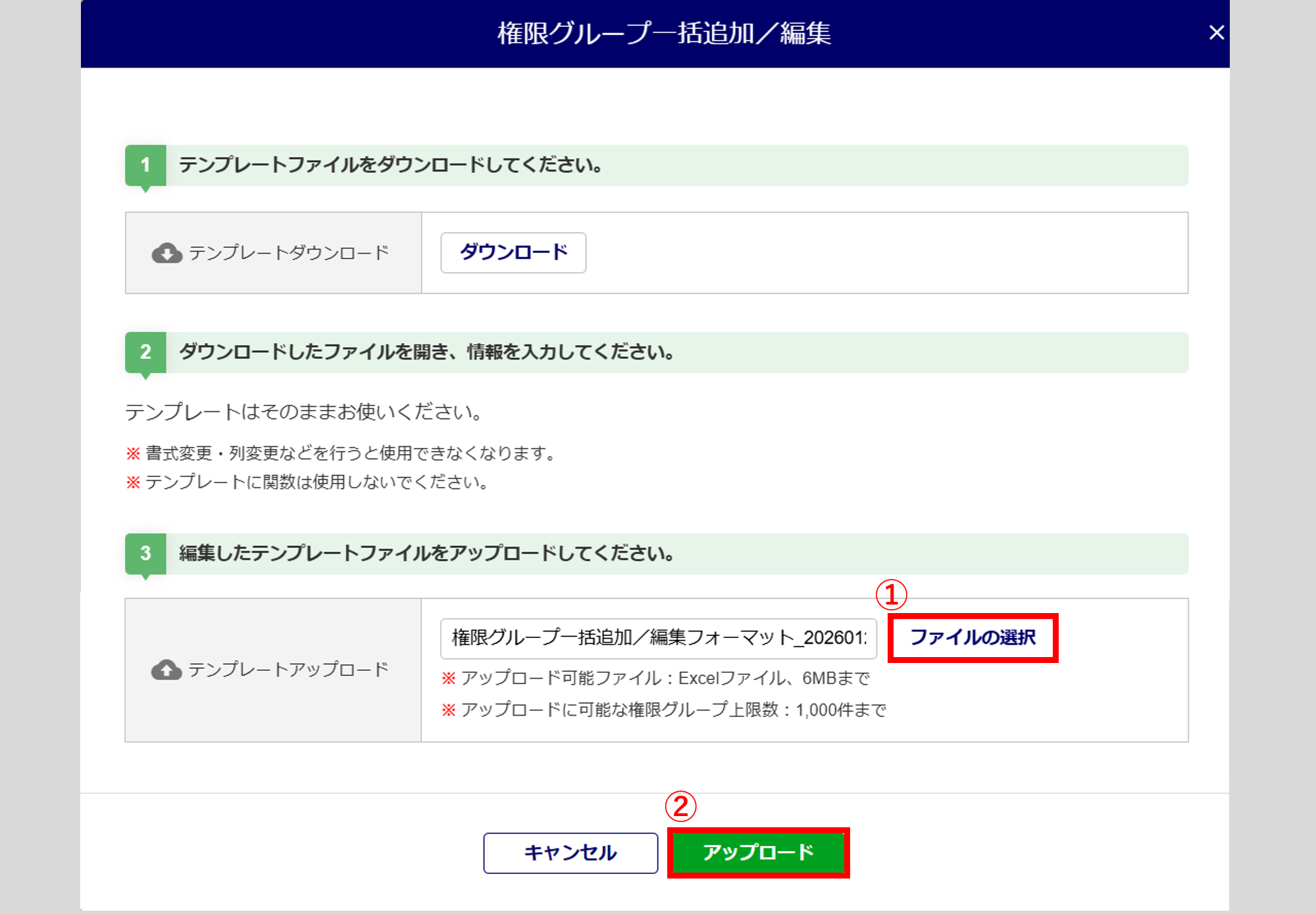 [ファイル選択](①)をクリックし、保存したファイルを選択、[アップロード](②)をクリックします。