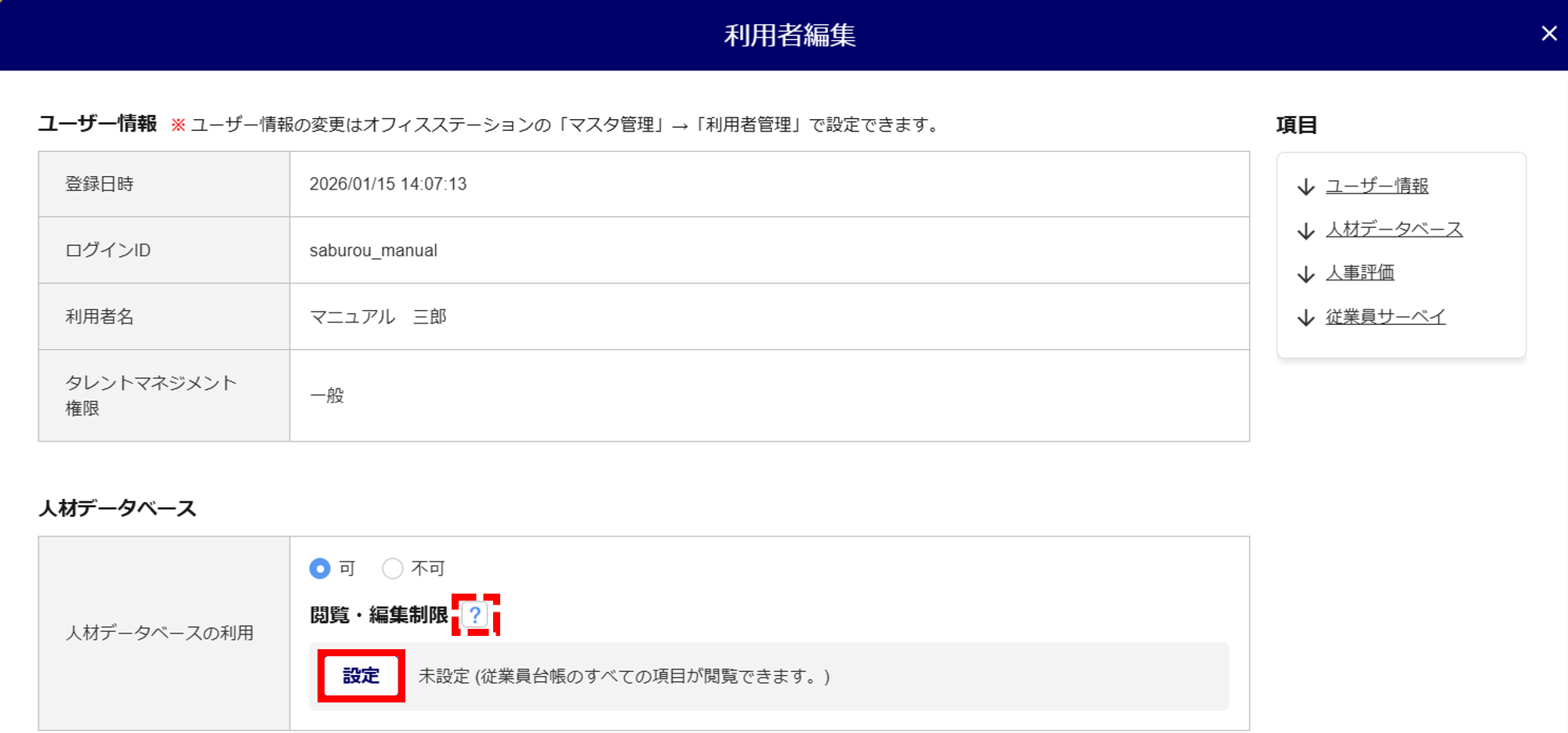 (はてなマーク)]をクリックすると、人材データベース 閲覧・編集制限についての詳細を確認できます。
