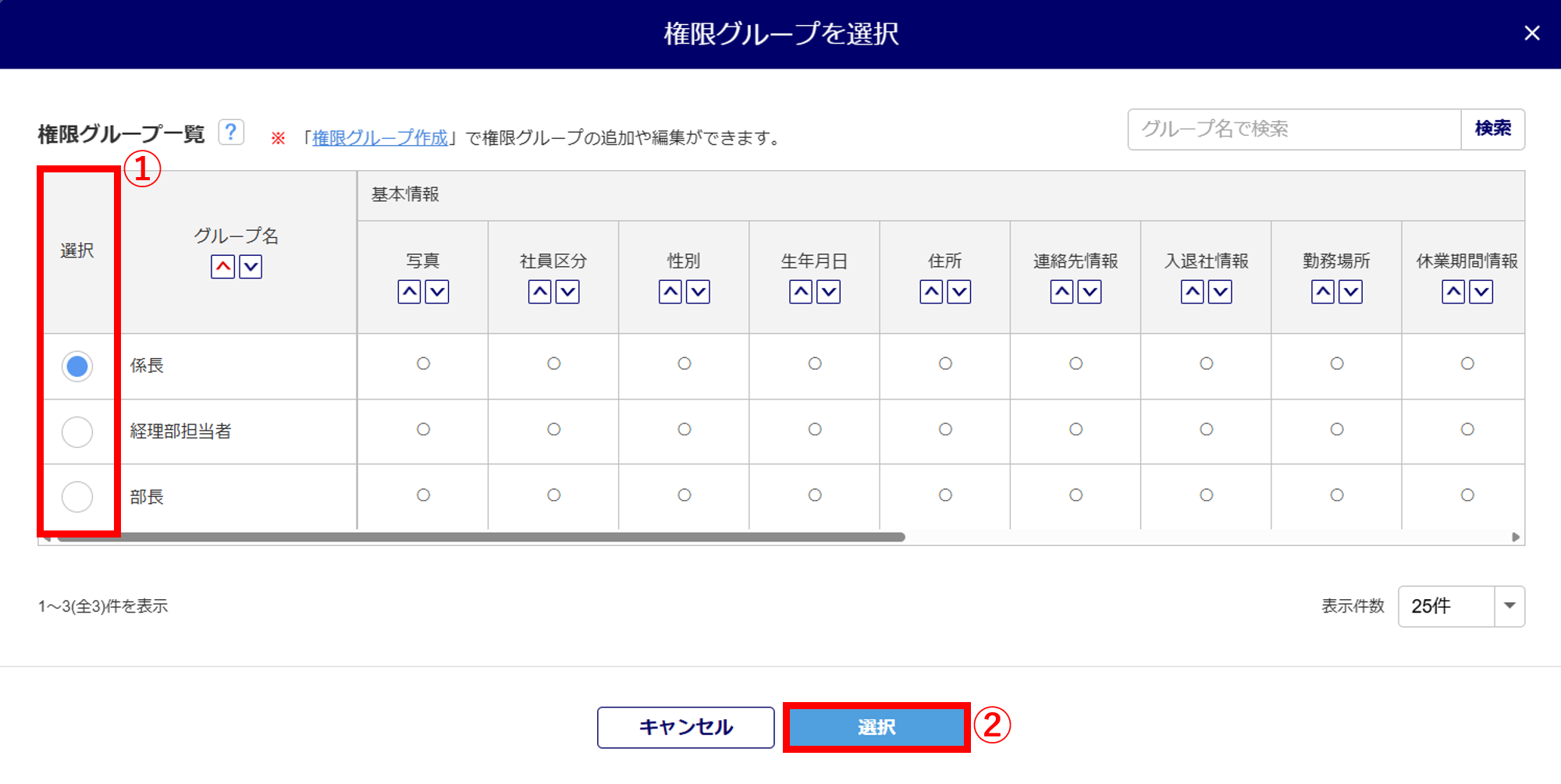 設定する閲覧グループの「選択」列(①)を選択し、[選択](②)をクリックします。