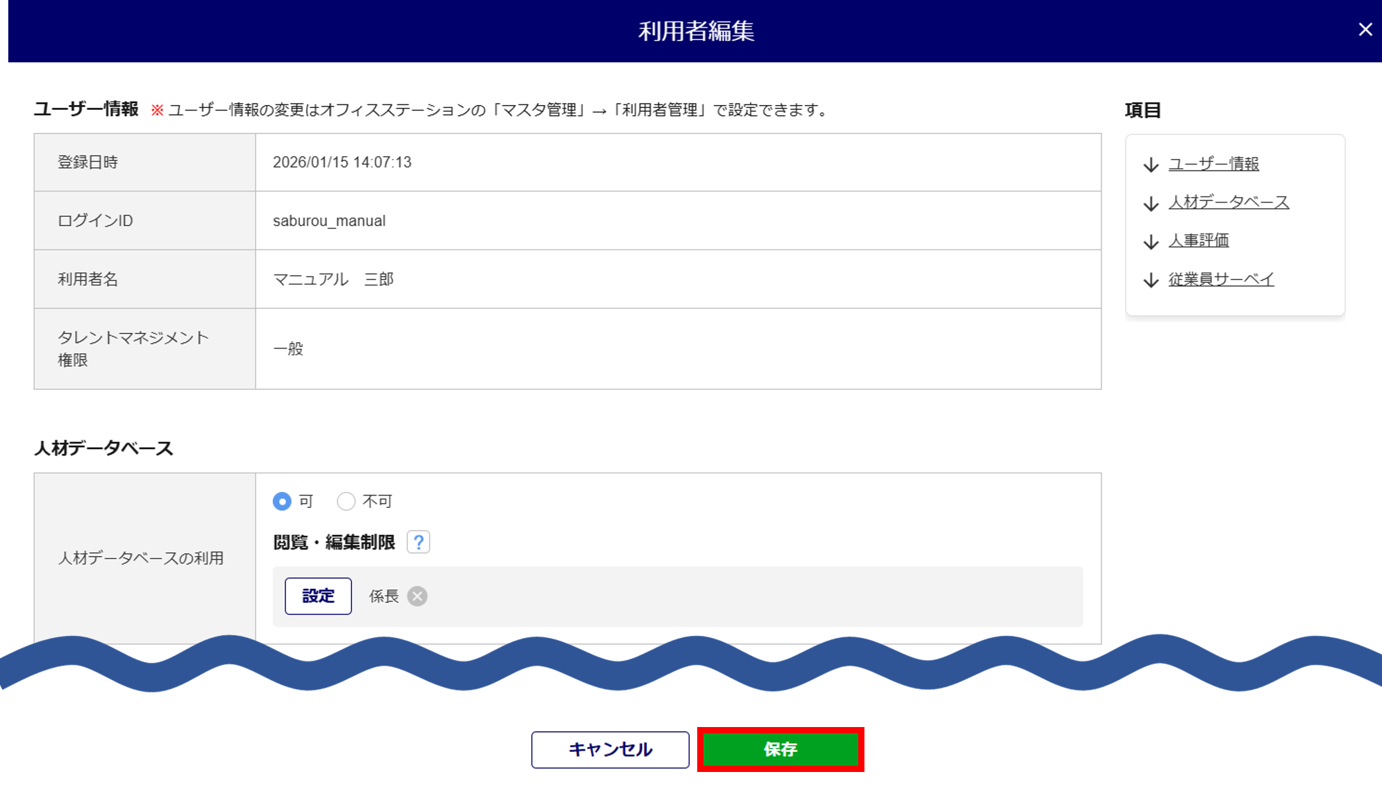 人材データベースの制限を設定する利用者名をクリックします。