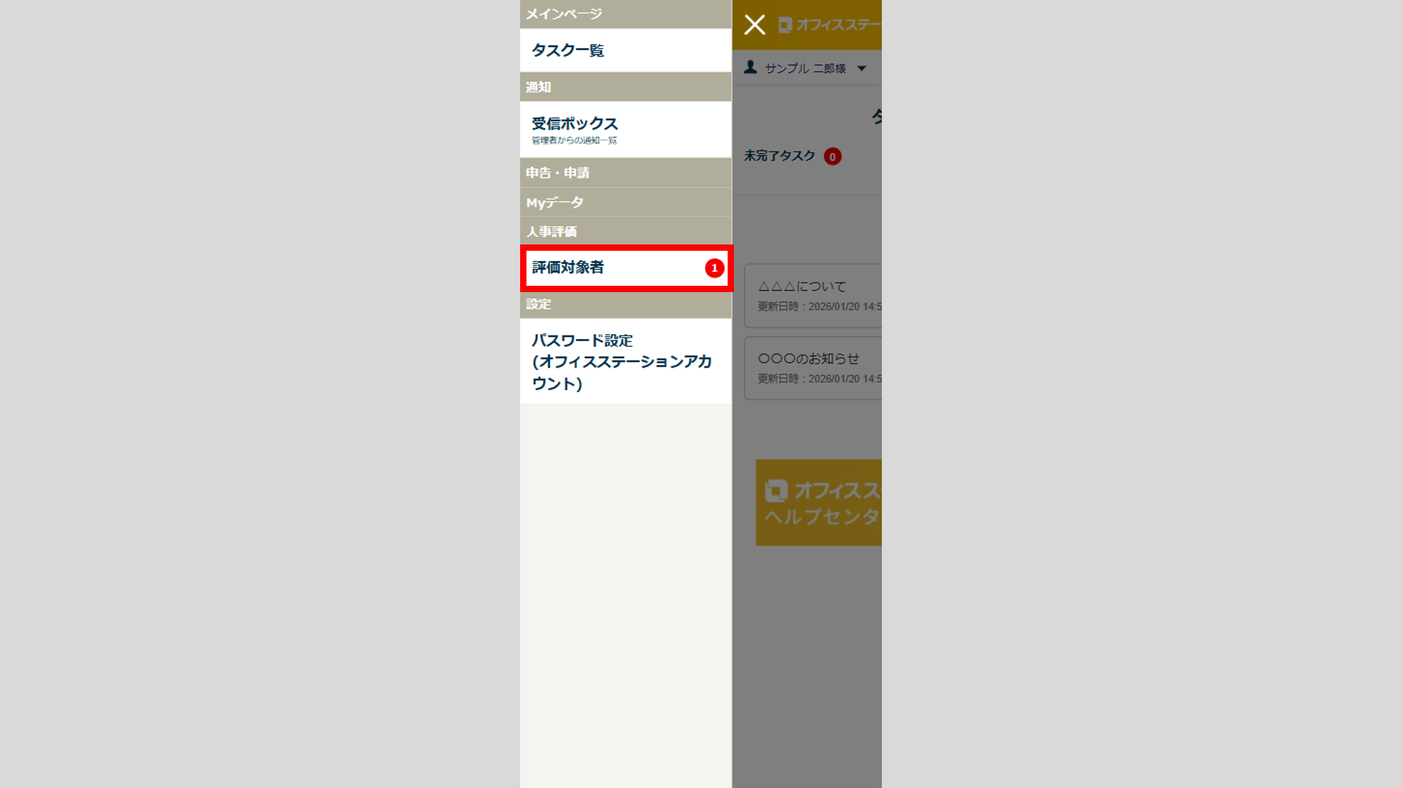ログイン後、画面左上の[MENU]>[評価対象者]をクリックします。