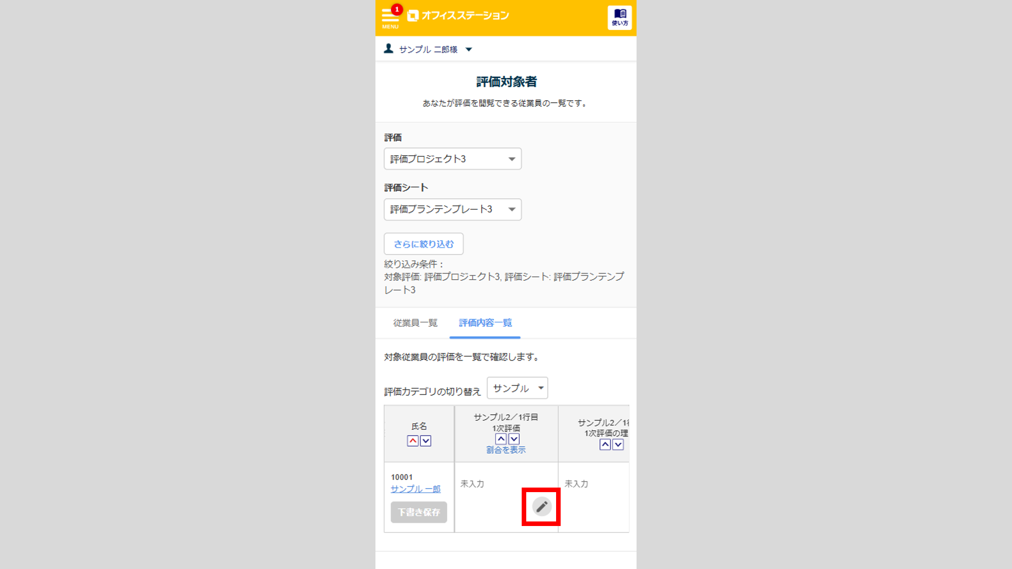 従業員マイページの「評価内容一覧」画面で、各従業員の評価内容を編集する方法について、ご説明します。