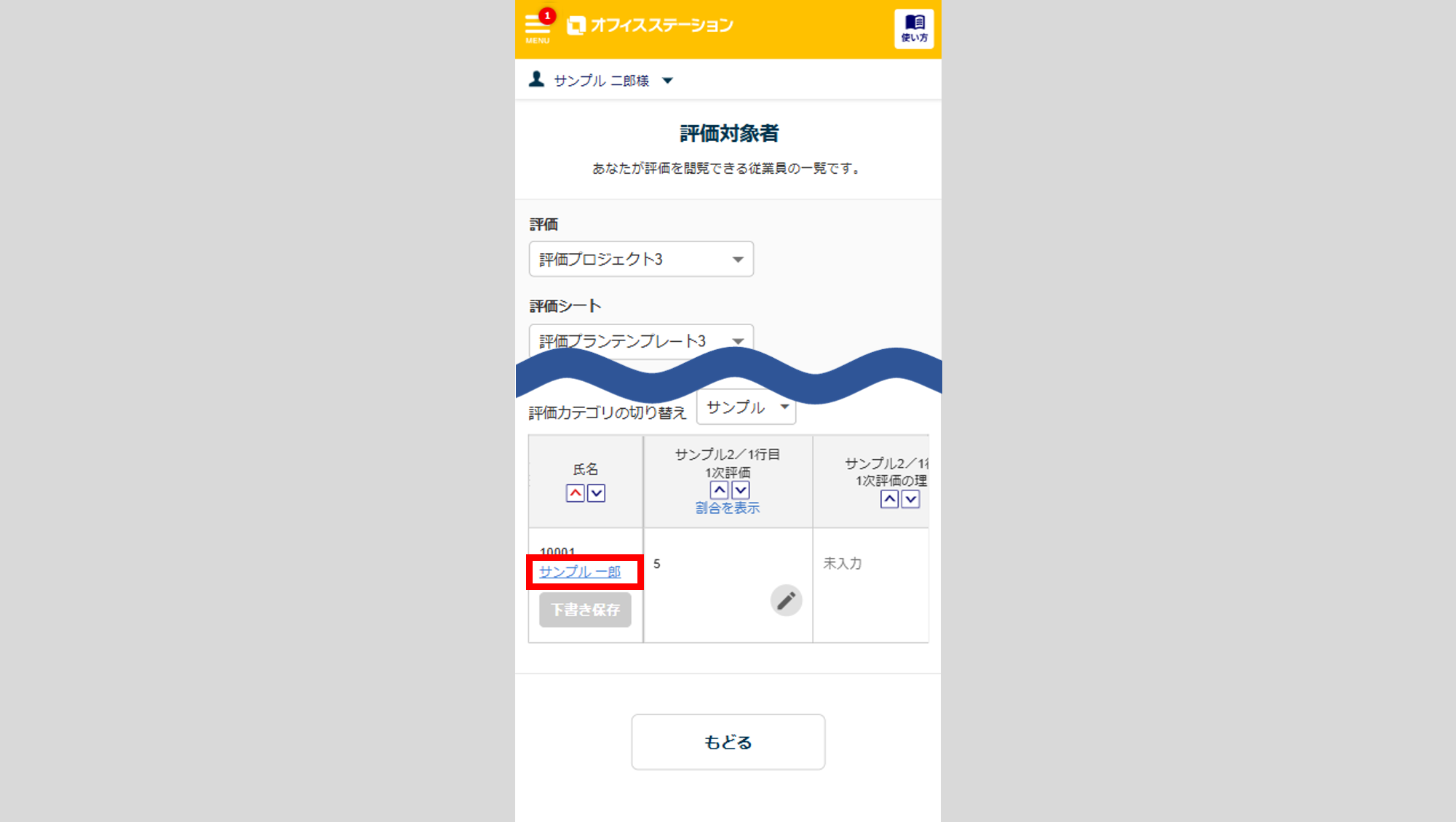 「以下の従業員の評価を下書き保存しました。」と表示されると下書き保存が完了です。