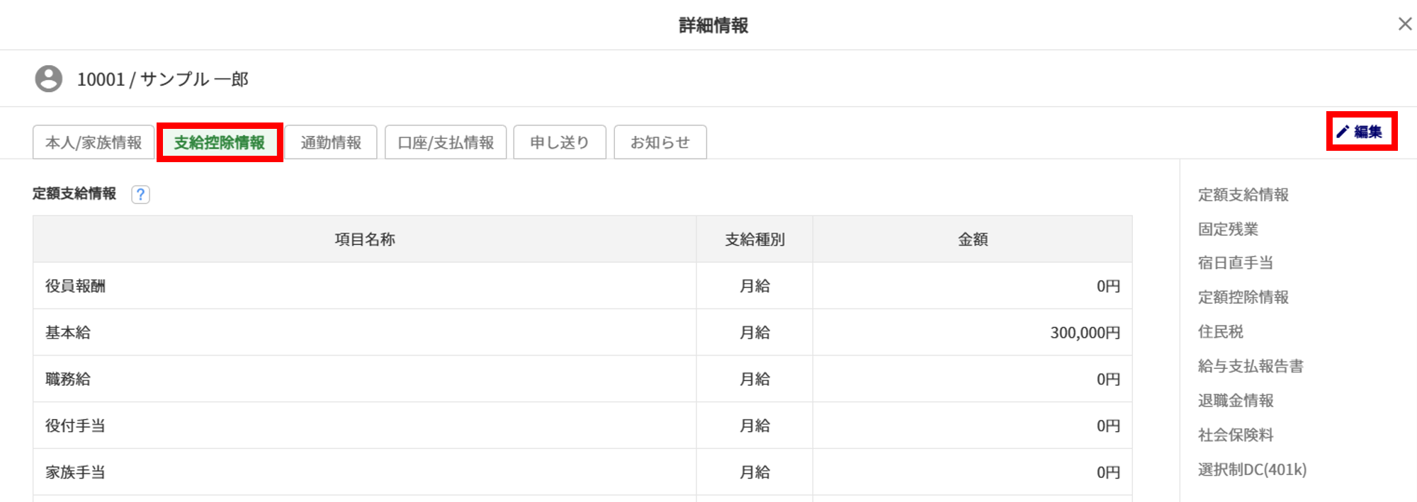 「支給控除情報」タブを選択し、[編集]をクリックします。