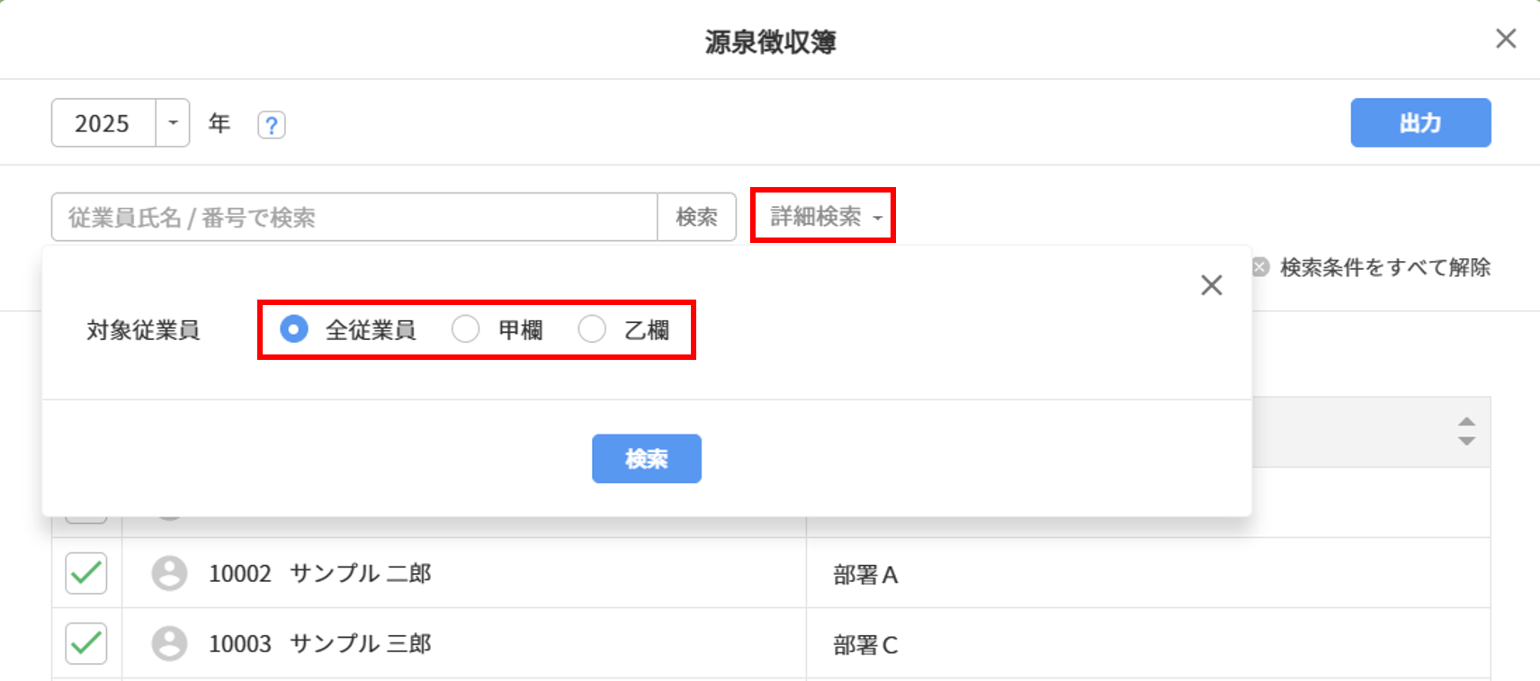 [詳細検索]をクリックすると、出力対象の従業員を選択できます。