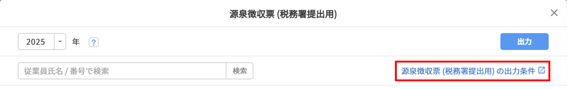 [源泉徴収票(税務署提出用)の出力条件]をクリックすると、出力条件について確認できます。