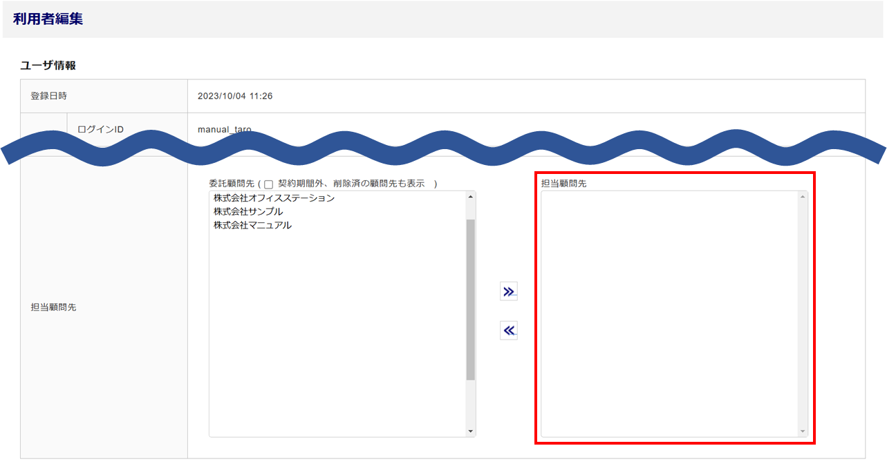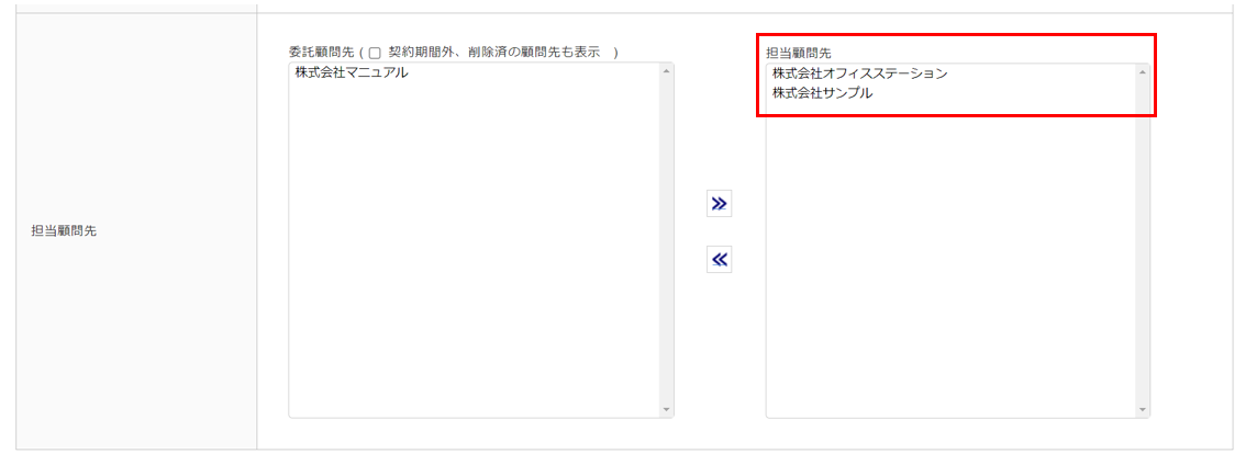 「担当顧問先」項目の右側の「担当顧問先」に設定されている企業を確認します。