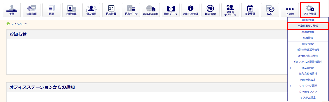 [マスタ管理]>[士業用顧問先管理]をクリックします。