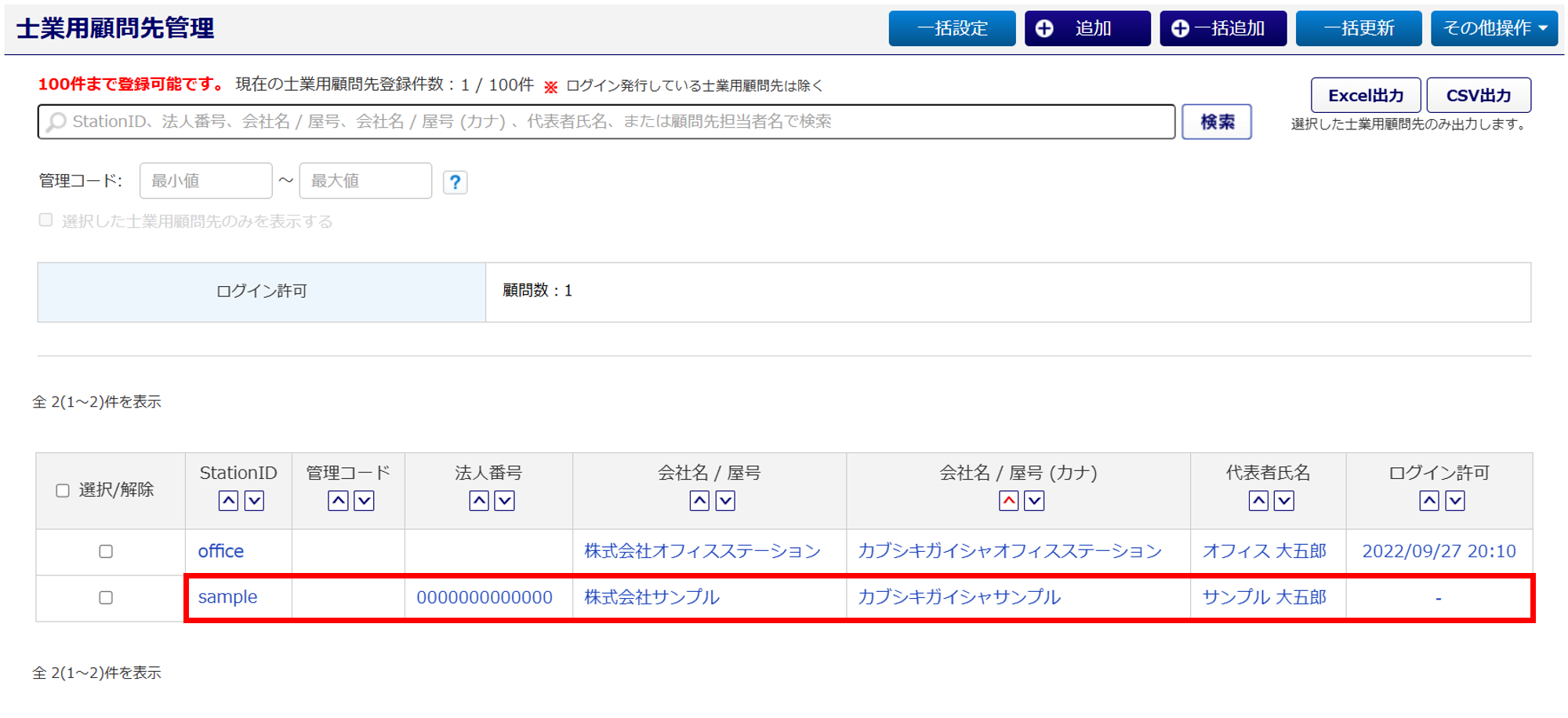 こちらに設定されている企業が、顧問先選択時に表示される企業となります。