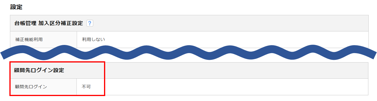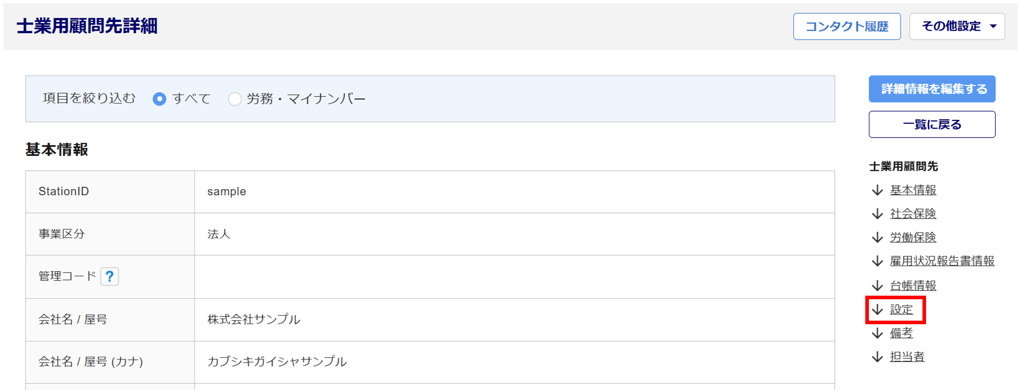 「士業用顧問先詳細」画面にて、画面右側「設定」カテゴリをクリックします。