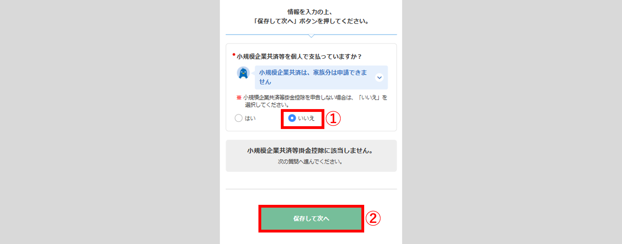 「独立行政法人中小企業基盤整備機構の共済契約の掛金」および「企業型年金加入者掛金」 「心身障害者扶養共済制度に関する契約の掛金」のいずれの情報も登録しない場合、「いいえ」()を選択し、[保存して次へ]()をクリックします。