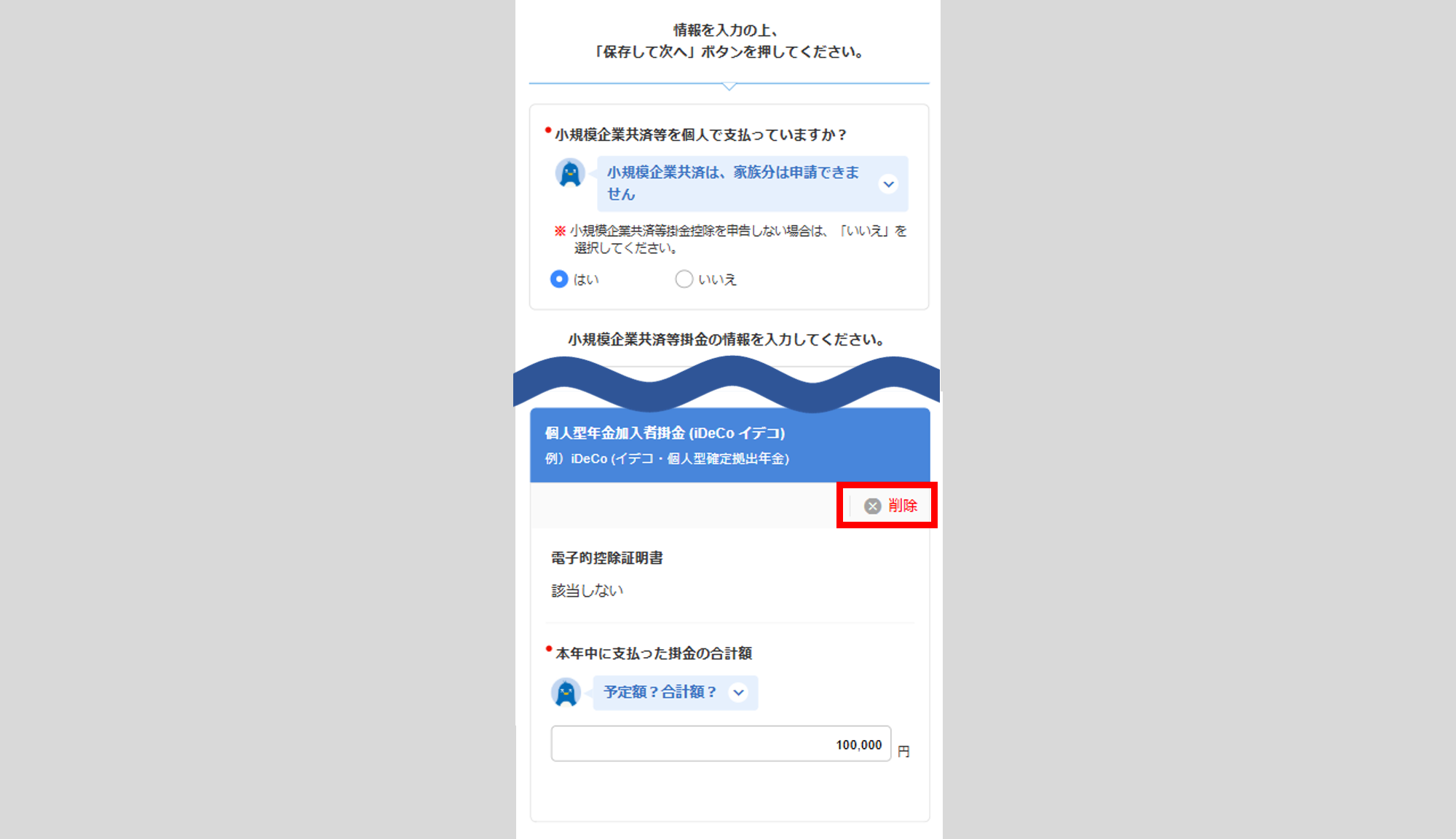 「独立行政法人中小企業基盤整備機構の共済契約の掛金」または「企業型年金加入者掛金」 「心身障害者扶養共済制度に関する契約の掛金」のいずれかの情報を登録する場合、「個人型年金加入者掛金(iDeco イデコ)」欄の[削除]をクリックします。