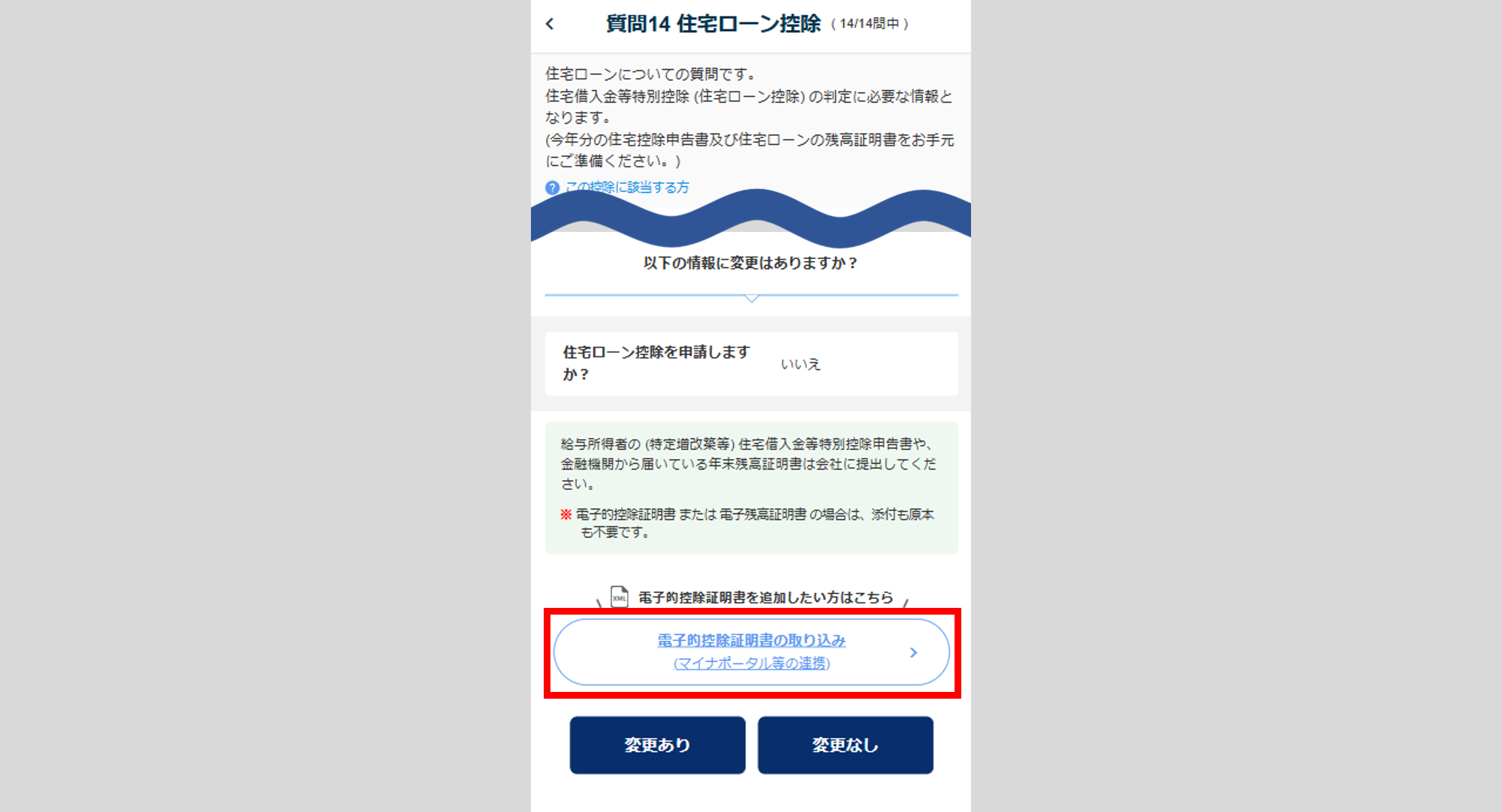 保存が完了すると、「質問14 住宅ローン控除」に進むため、画面下部の[電子的控除証明書の取り込み(マイナポータル等の連携)]をクリックします。