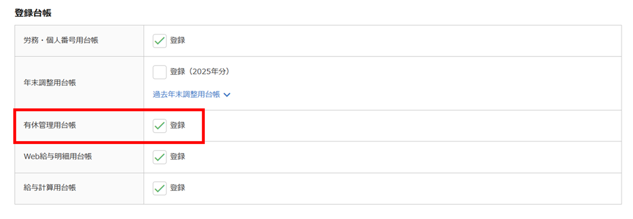 複数の製品を契約している場合のみ、従業員台帳の「有休管理用台帳」の登録をはずし、データを残せます。