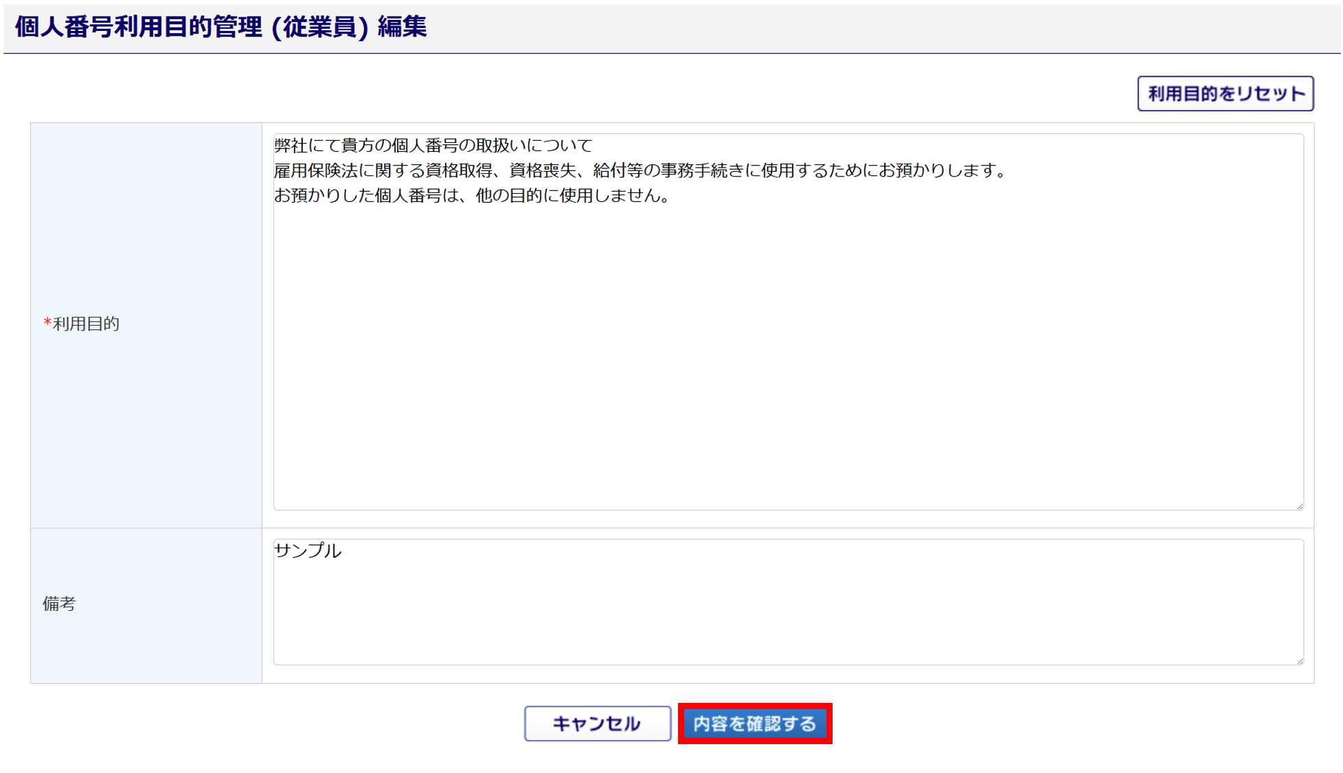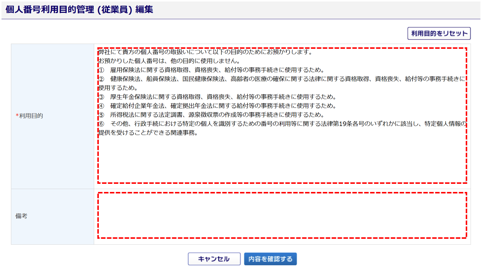 [利用目的をリセット]をクリックすると、初期値で設定されている利用目的が再度設定されます。
