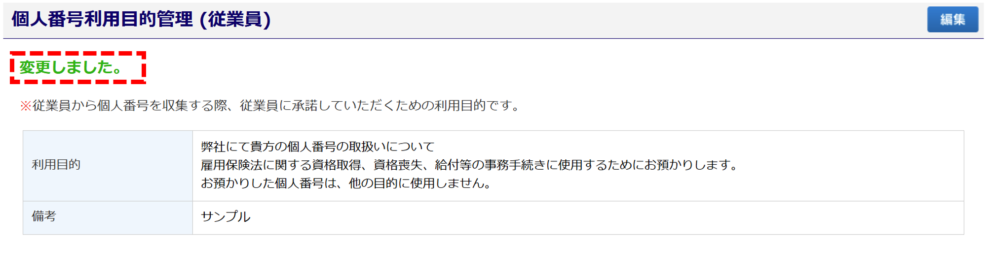 画面左上に「変更しました。」と表示されたら、個人番号利用目的管理の設定は完了です。